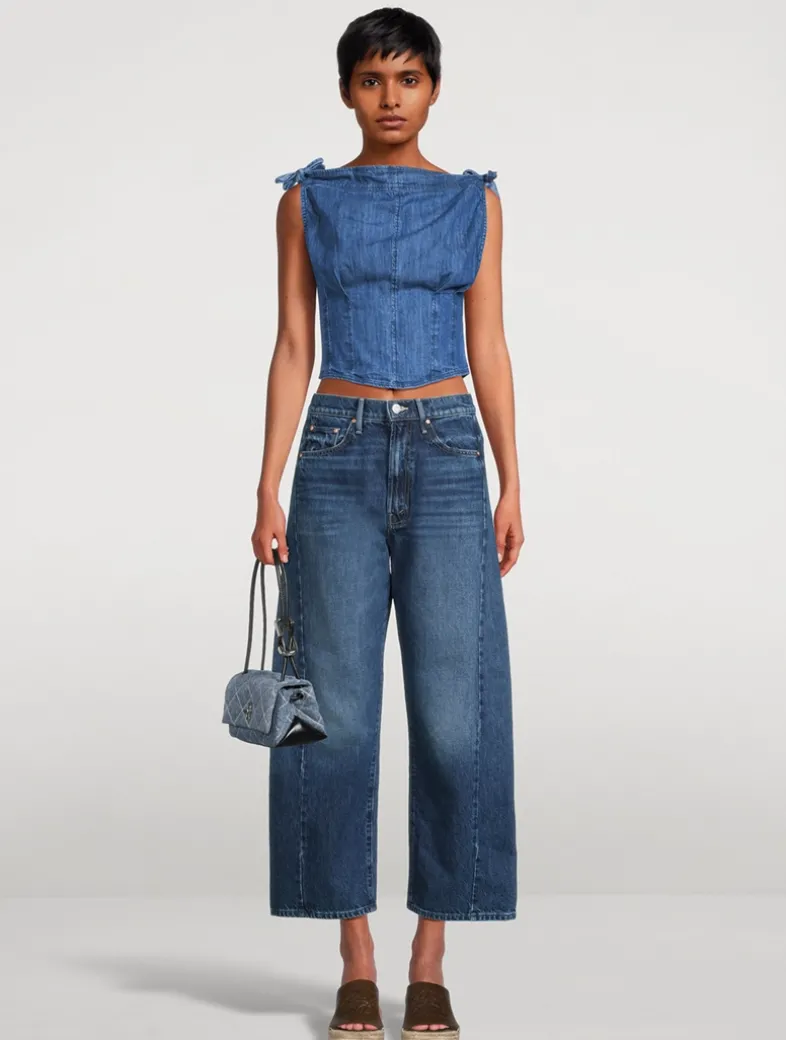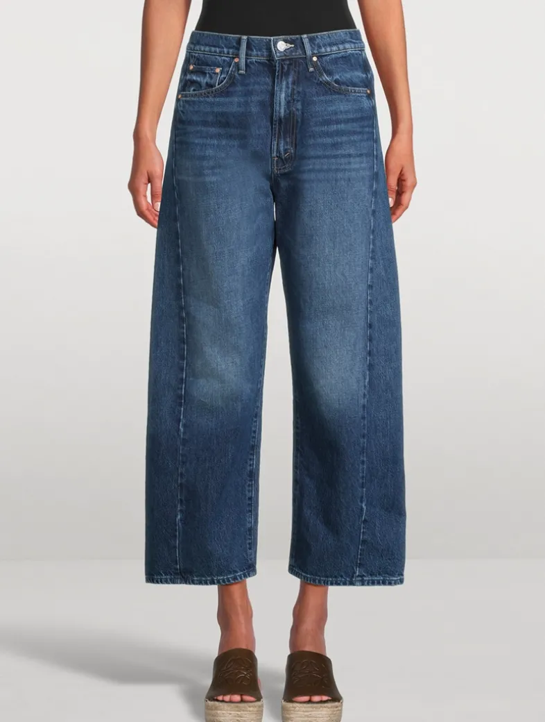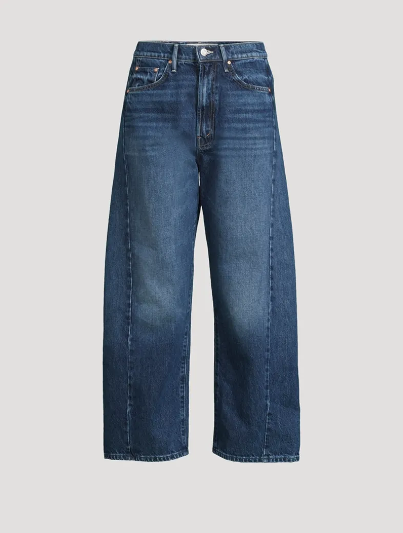 A super high-waisted jean with a wide, curved leg, an ankle-length inseam with a clean hem. These jeans are rigid and take time to break in.