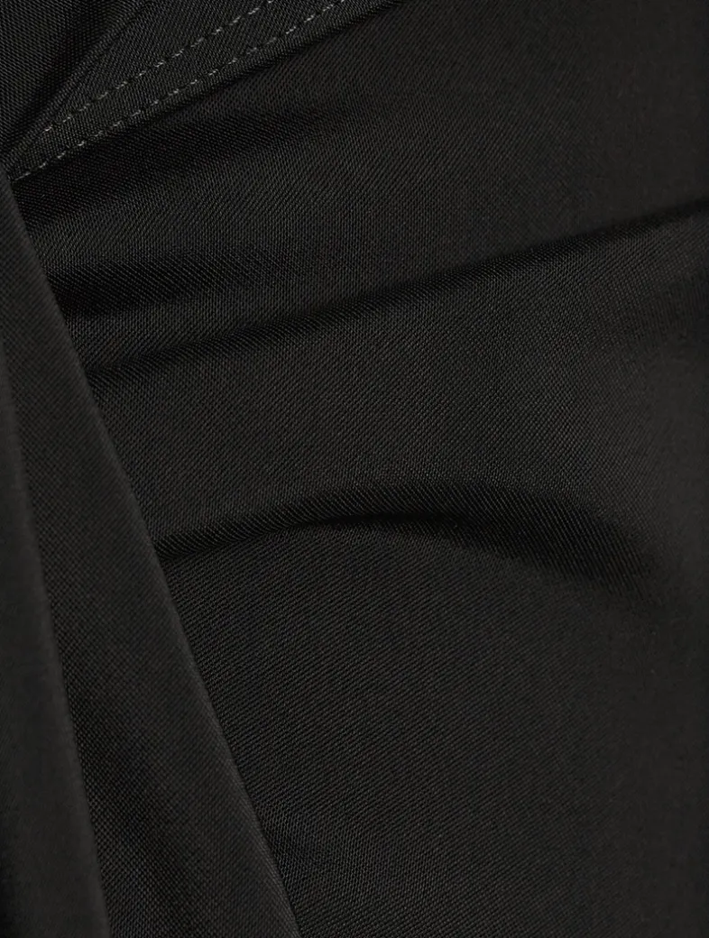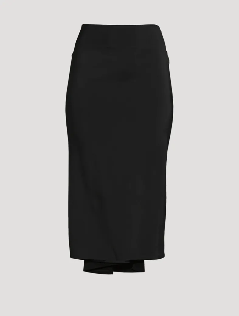 The minimalist silhouette of this stretch viscose pencil skirt is offset by a folded train detail in the back with a dipped waist. Cut to a high rise, it has a below-the-knee length and a twin stitched hem.