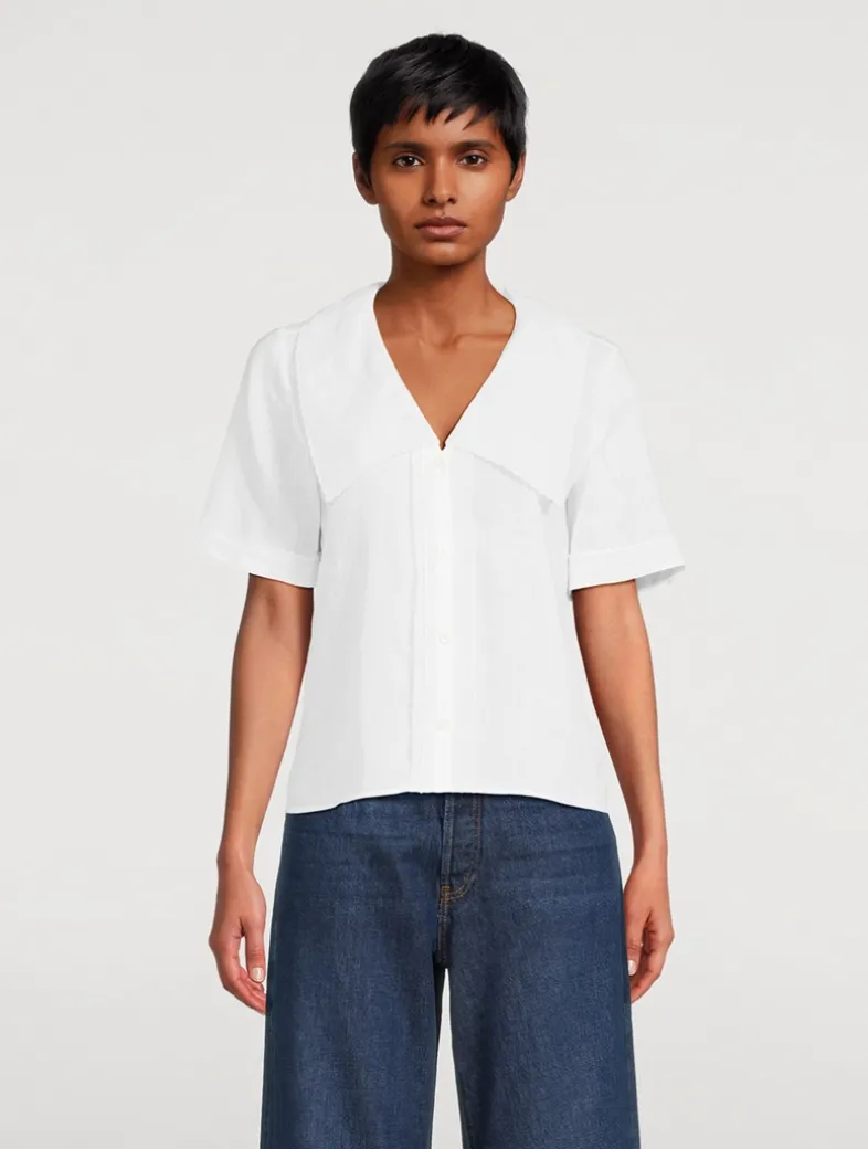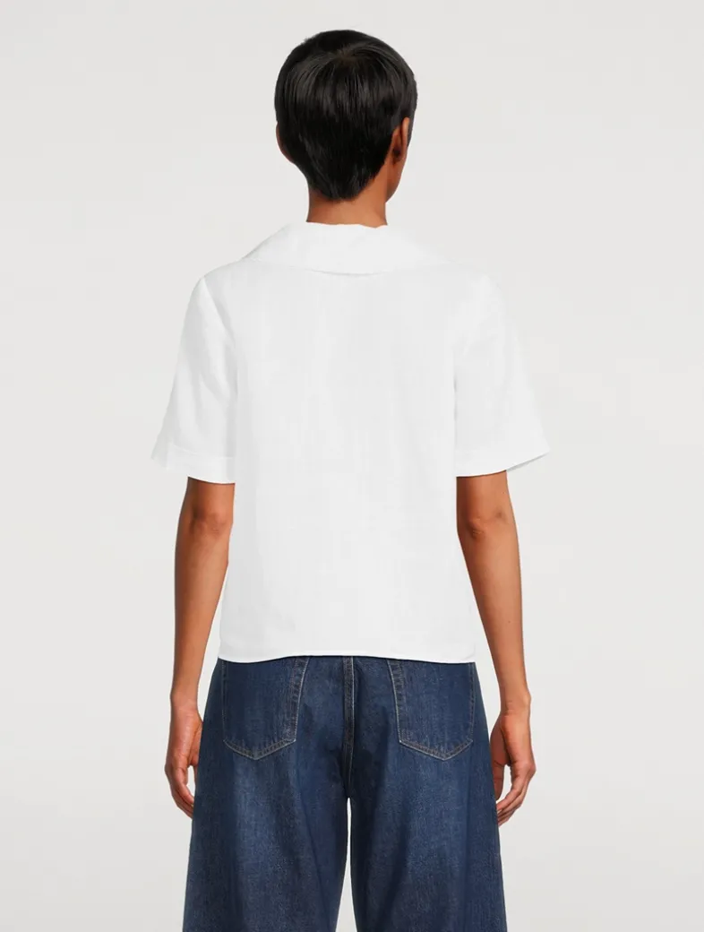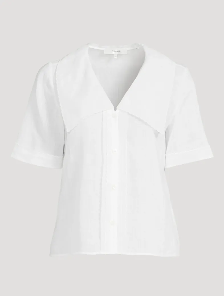 A short-sleeve take on classic shirting, finished with a soft sailor collar and tuxedo-inspired detailing at the placket. Cut from 100% ramie for a lightweight feel and easy drape. Embellished with delicate scalloped trim.