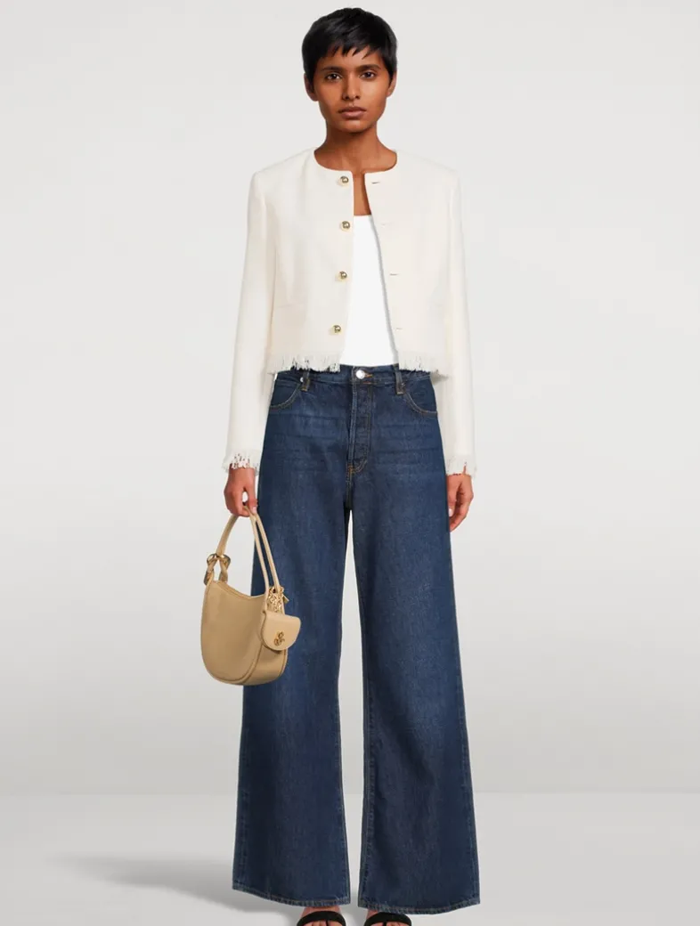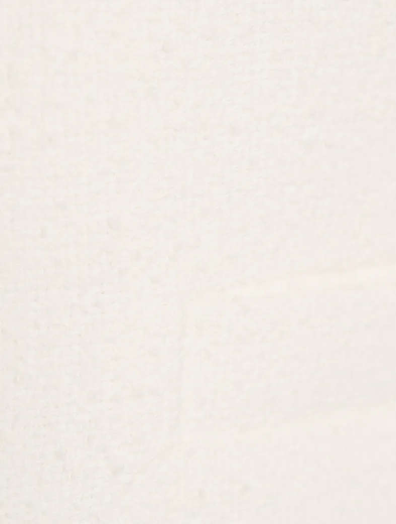Crafted from a cotton-blend tweed, this timeless topper is cut to a boxy silhouette with a cropped length and padded shoulders. It is embellished with polished metal buttons and soft fringe trim.