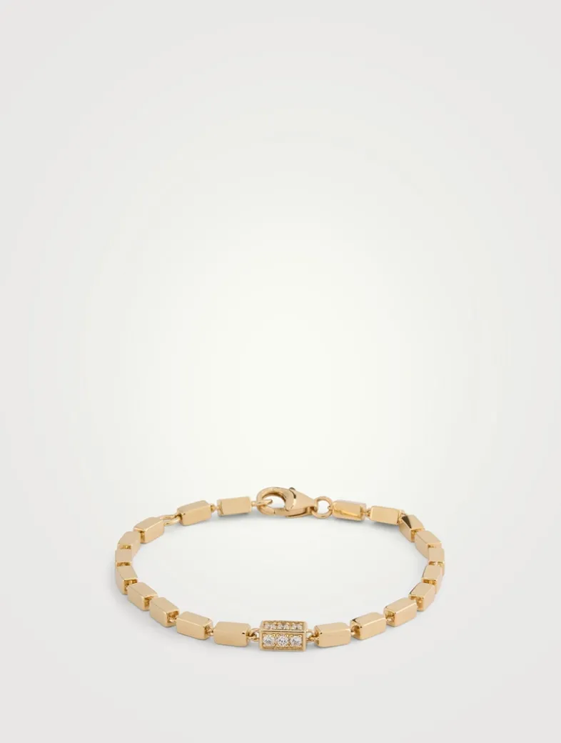 Crafted from solid 18k gold, this block-chain bracelet traces a line of four-sided links, with one link set with pavé white diamonds on all sides, and thick chains that add a contemporary edge to its timeless design.