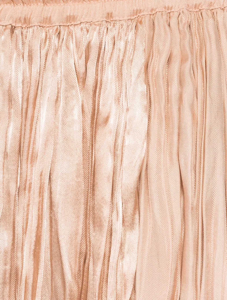 So silky and forever femme, this sweet mini skirt is featured in a high-rise, A-line fit with tiered pleating at the bottom and flouncy, raw-edge hemline.