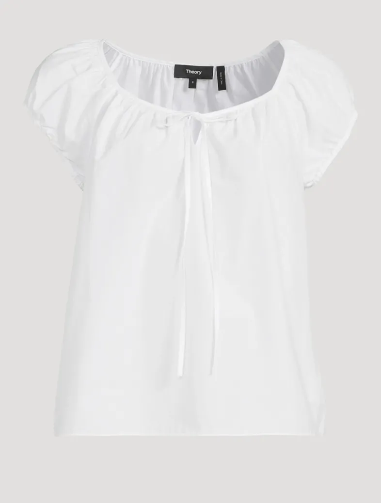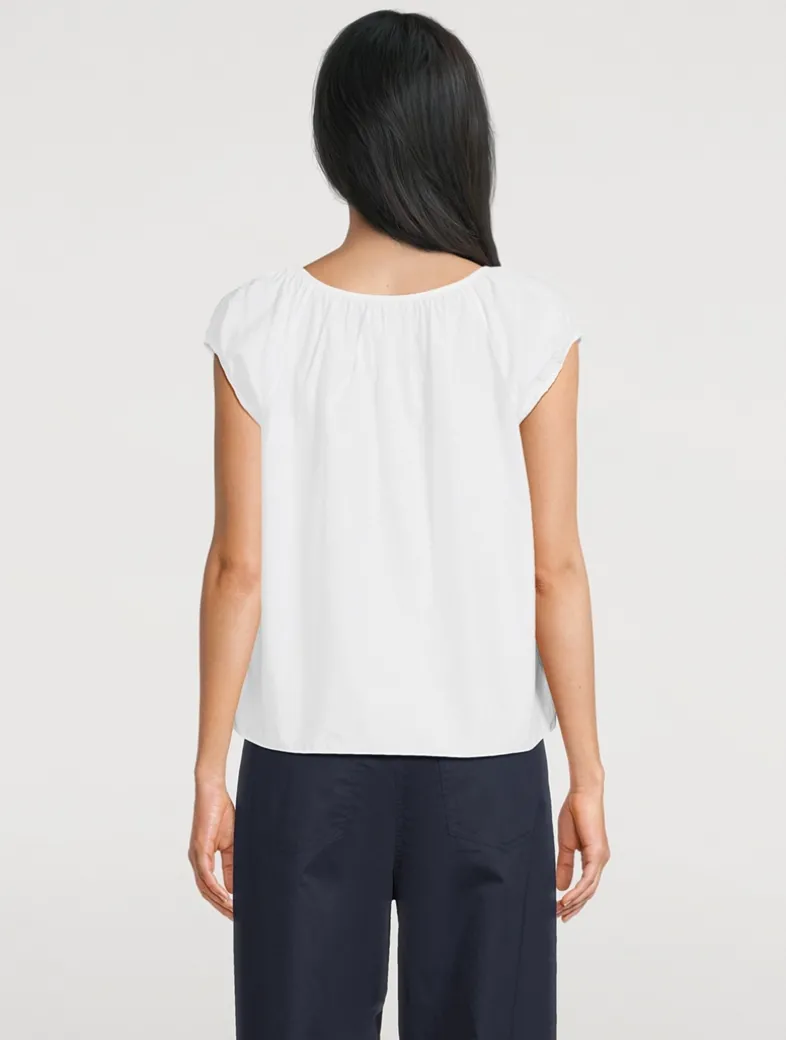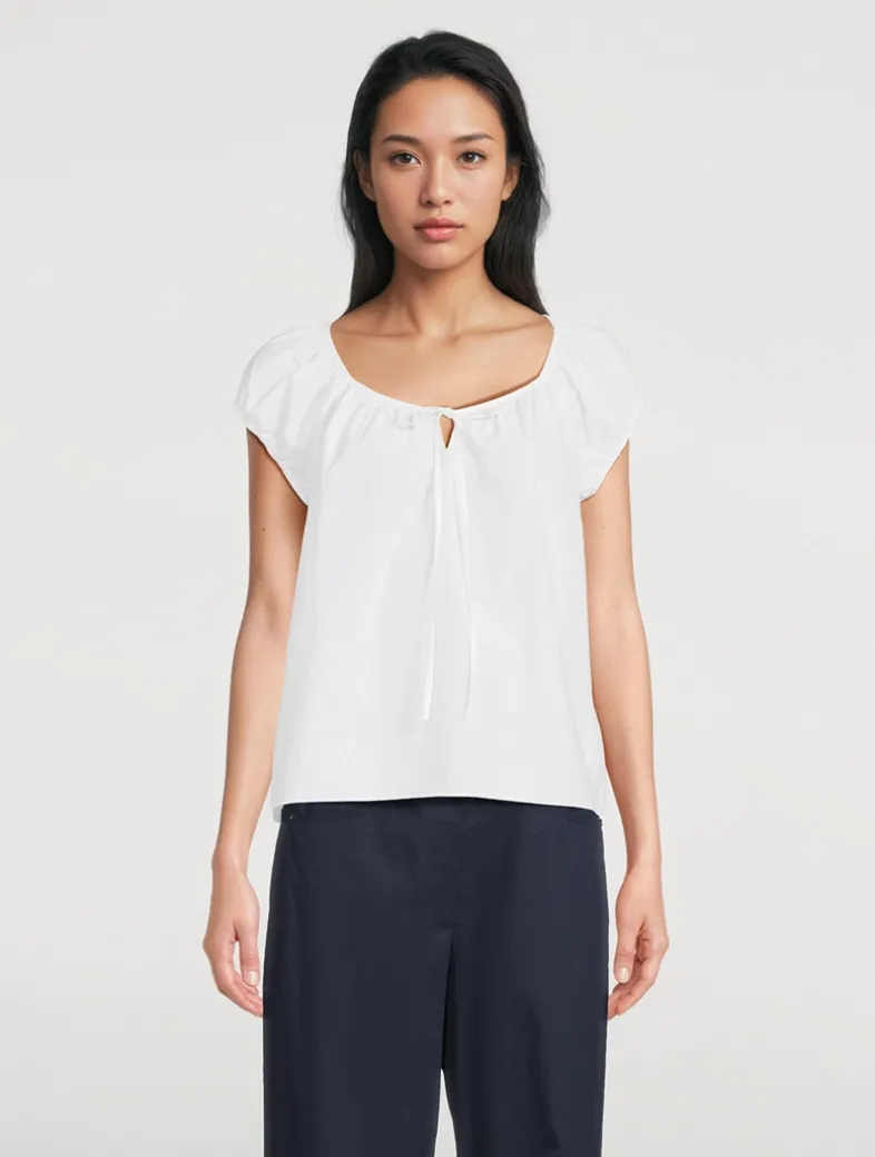 This lightweight blouse offers a comfortable, oversized fit with cap sleeves and tie accents at the scoop neckline. It’s crafted in a tumbled fabrication woven with a blend of cotton and recycled nylon by a leading Japanese mill.
