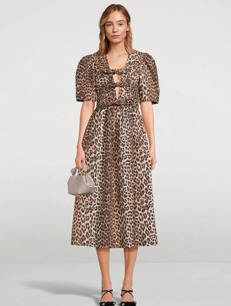 Defined by GANNI’s classic elements, this leopard-printed midi dress is crafted from crisp organic cotton. It features a deep V-neckline cinched with three tie bands at the front.