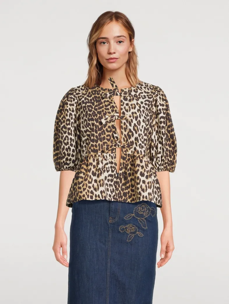 This leopard-printed peplum top is made from organic cotton. The blouse is designed for a relaxed fit and features an open round neckline with tie bands and short puff sleeves with elastic edges.