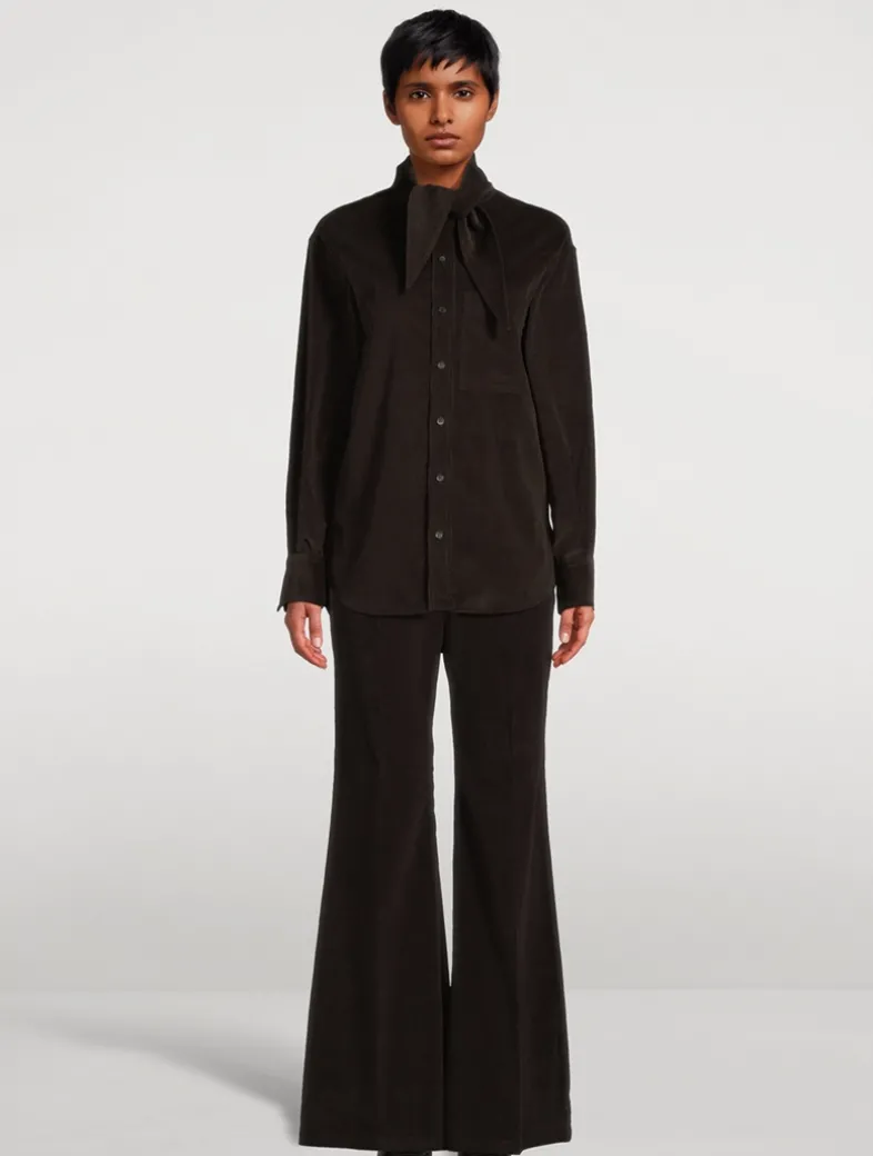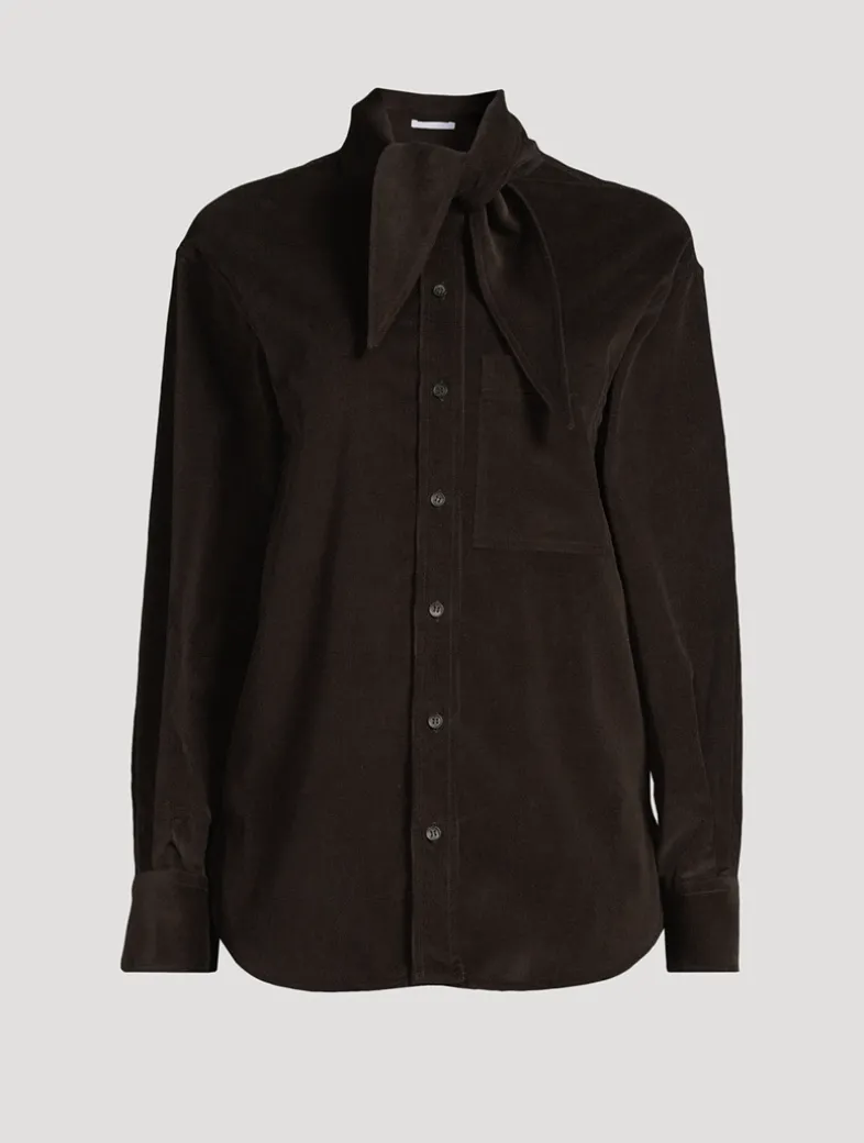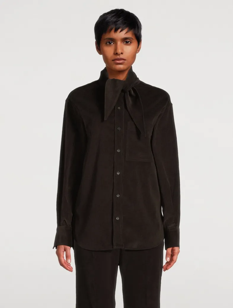 This shirt is cut from sumptuous corduroy with a soft and warm feel. A kerchief collar adds a unique twist to this button-up with utility pockets and an asymmetrical rounded hem.
