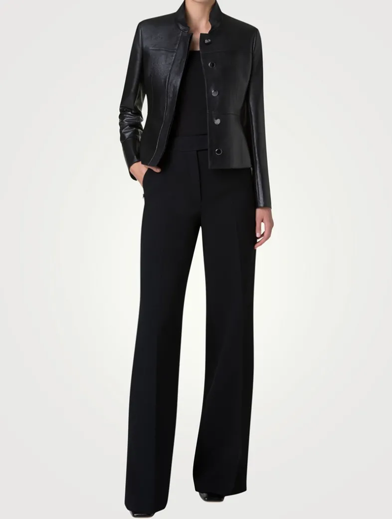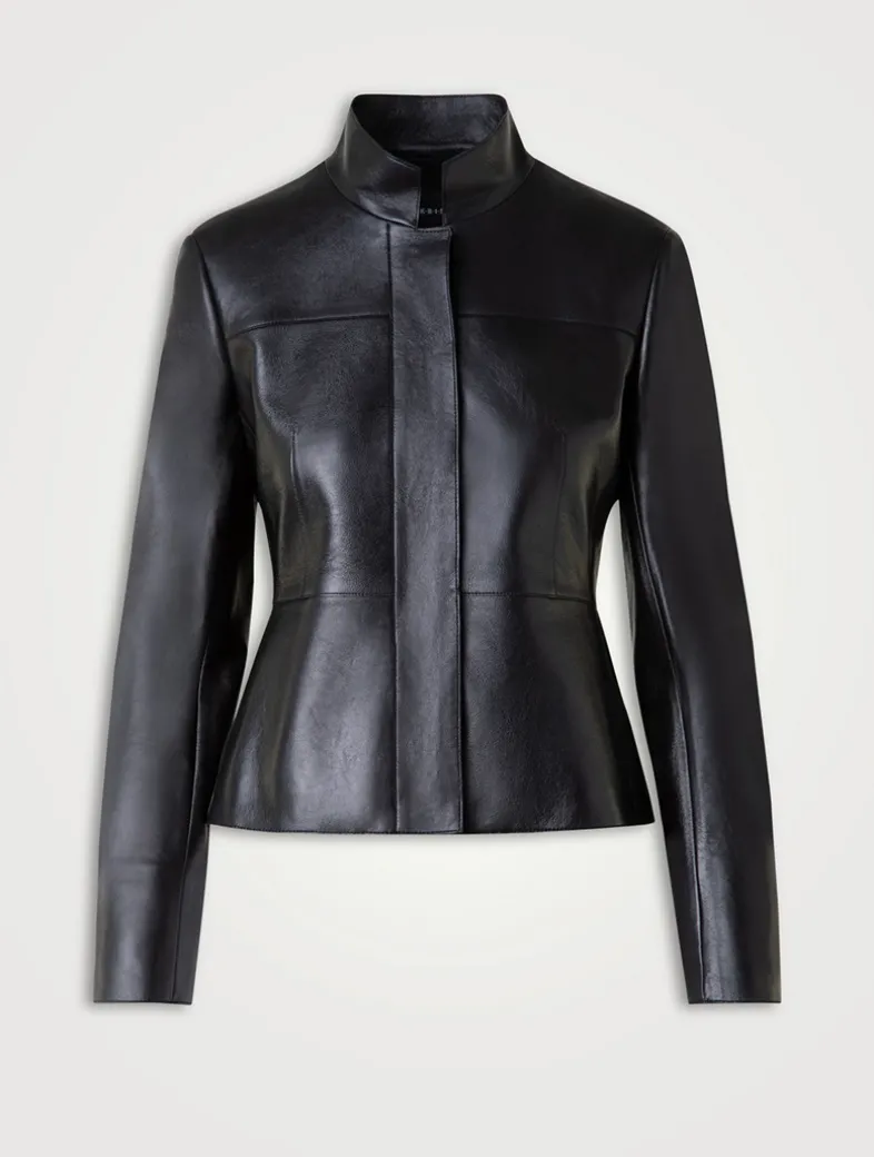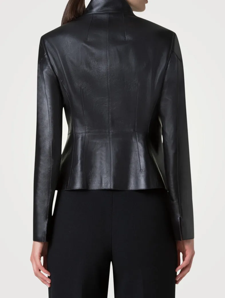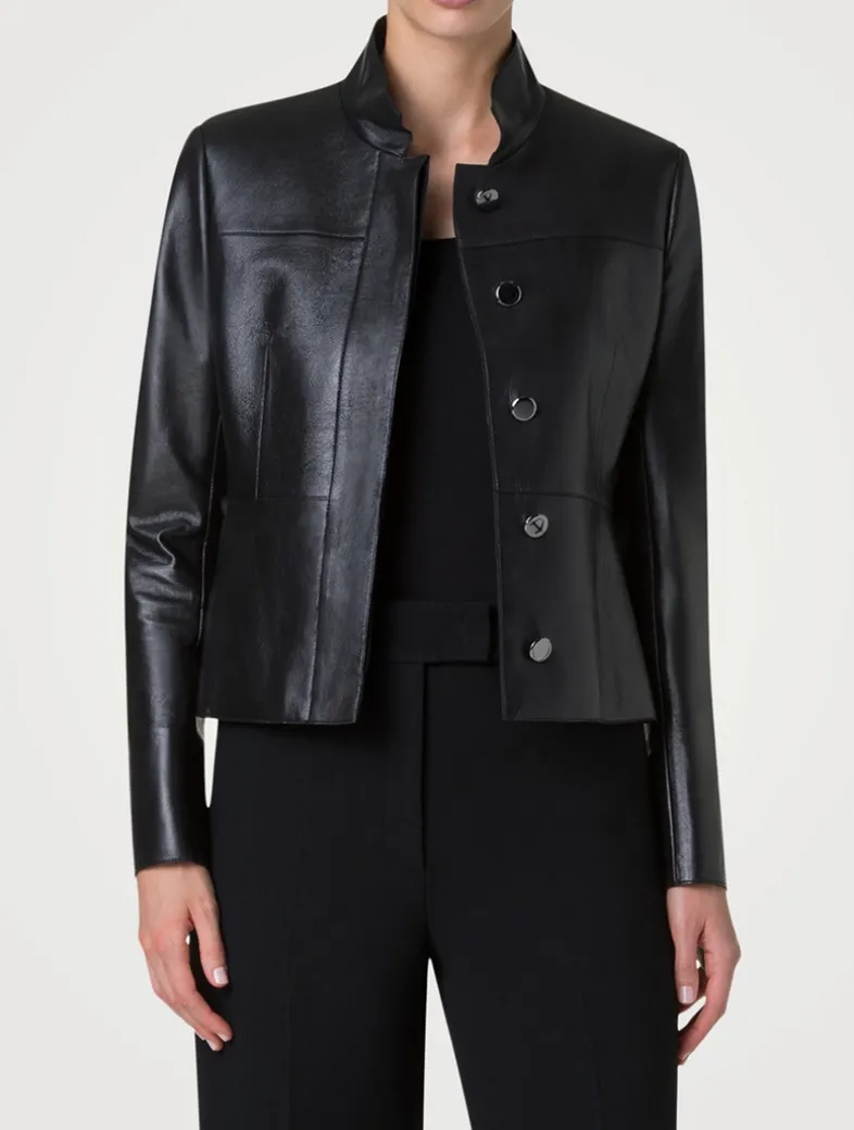 Made from lacquered Nappa leather in a flattering fitted silhouette, this beautifully crafted jacket features a mock neck, pockets, and cuff vents. The concealed front button closure keeps this piece looking sleek and polished.