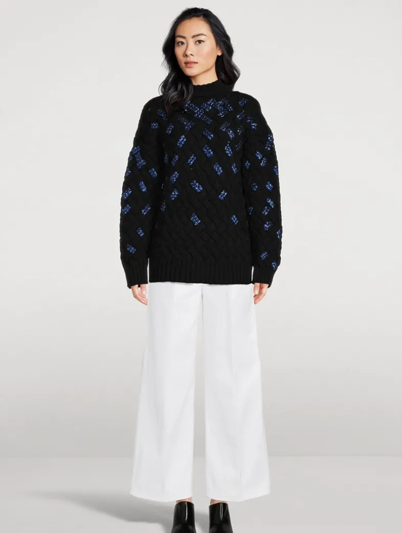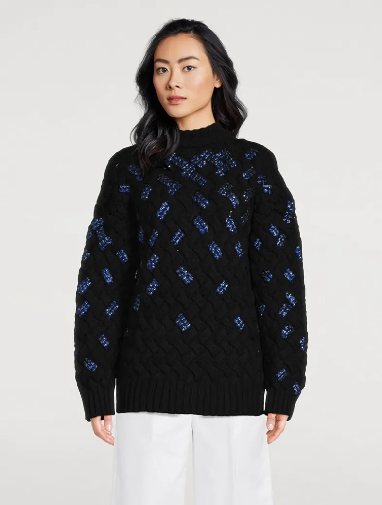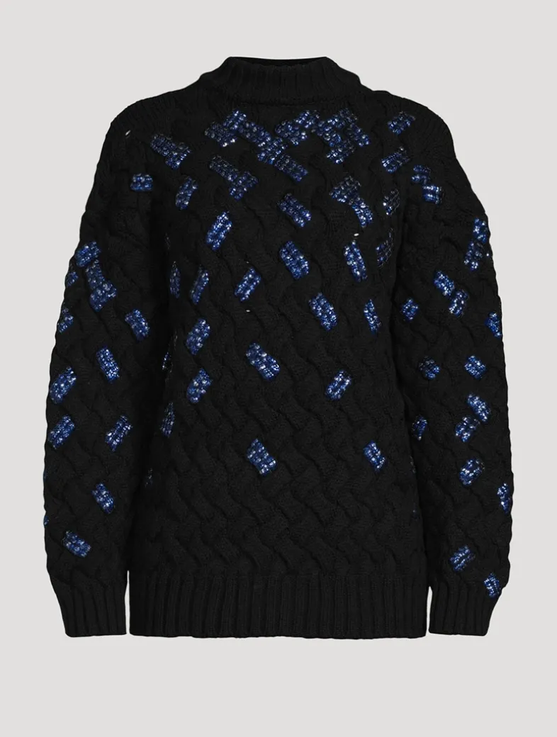 This pullover is knit from wool and woven in a faux crosshatch pattern embellished with dazzling beaded embroidery, lending a hint of sparkle to the piece. It has a slouchy silhouette with a crew neckline and dropped shoulders.