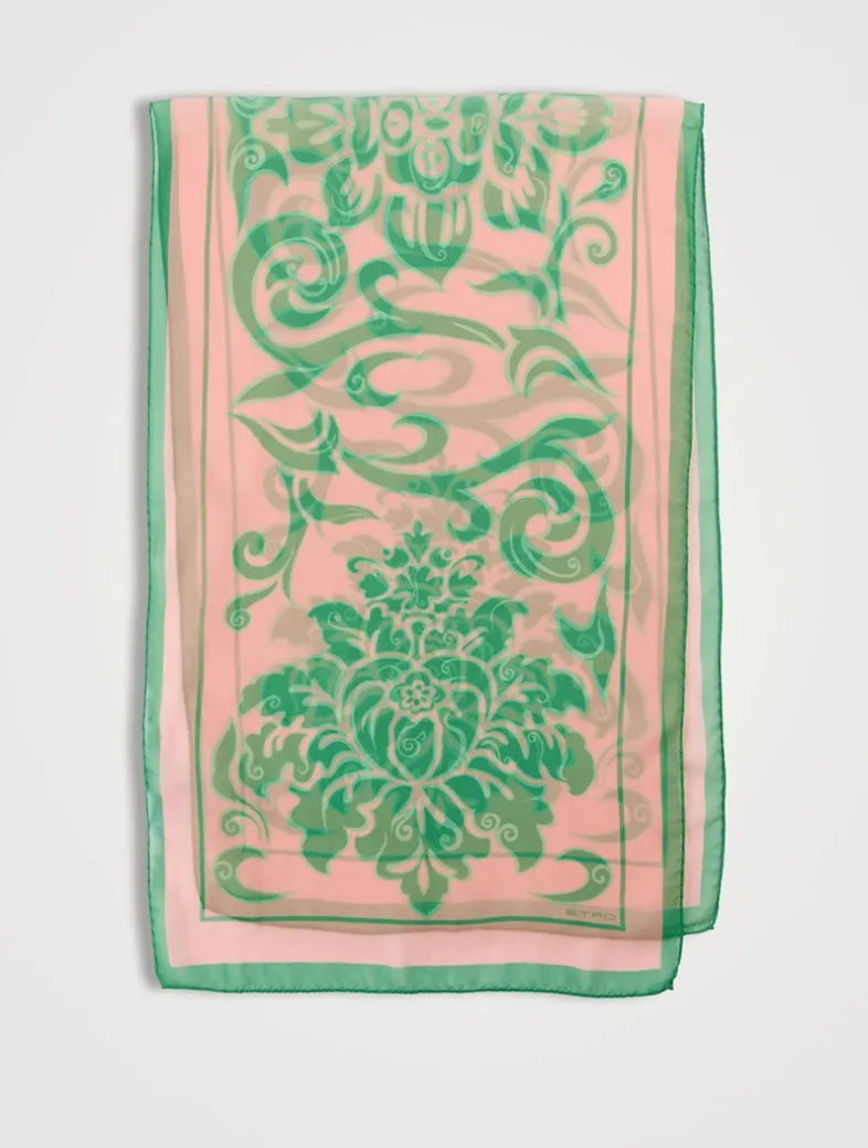Crafted in Italy, this pure silk scarf features a graphic floral motif. The Etro logo in the corner completes the accessory.