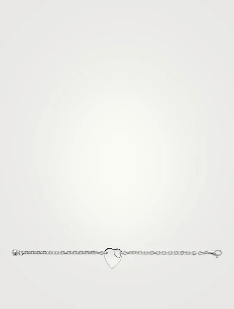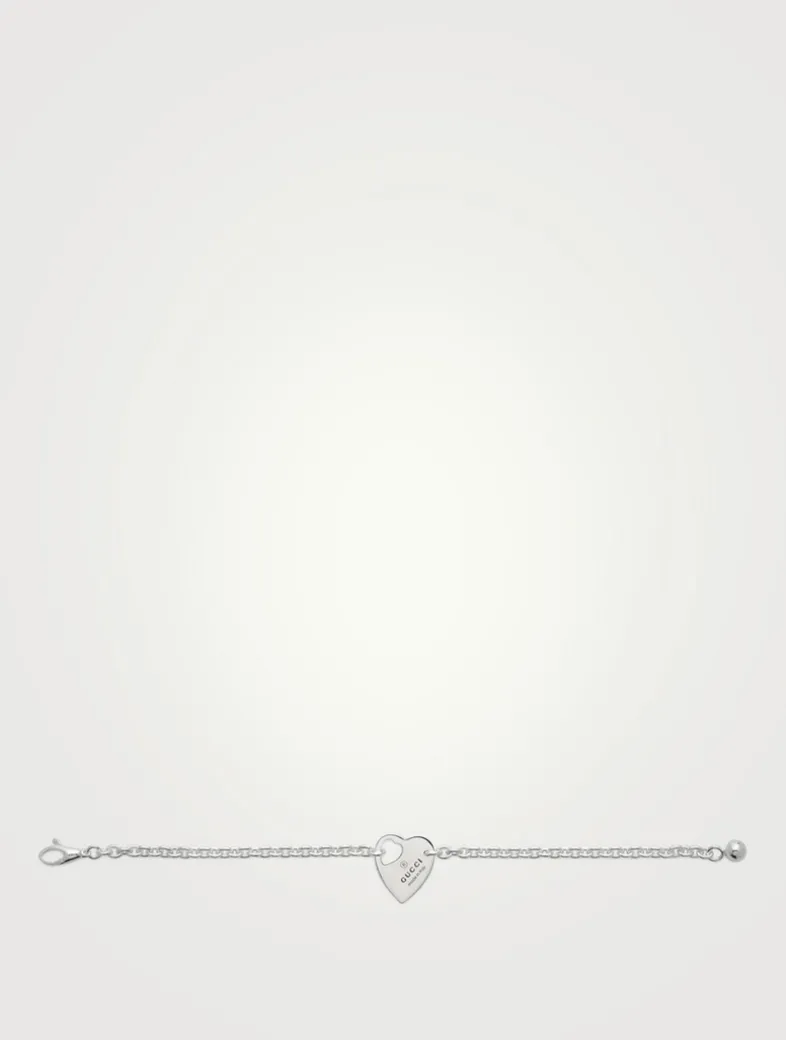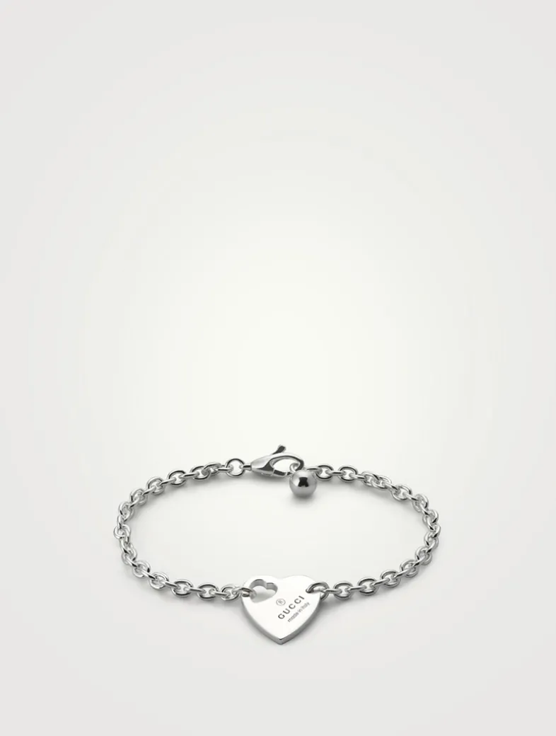 Set on a sterling silver chain, this delicate bracelet features a cut-out heart within the heart charm with Gucci Trademark engraving, and a clasp closure with silver baule.