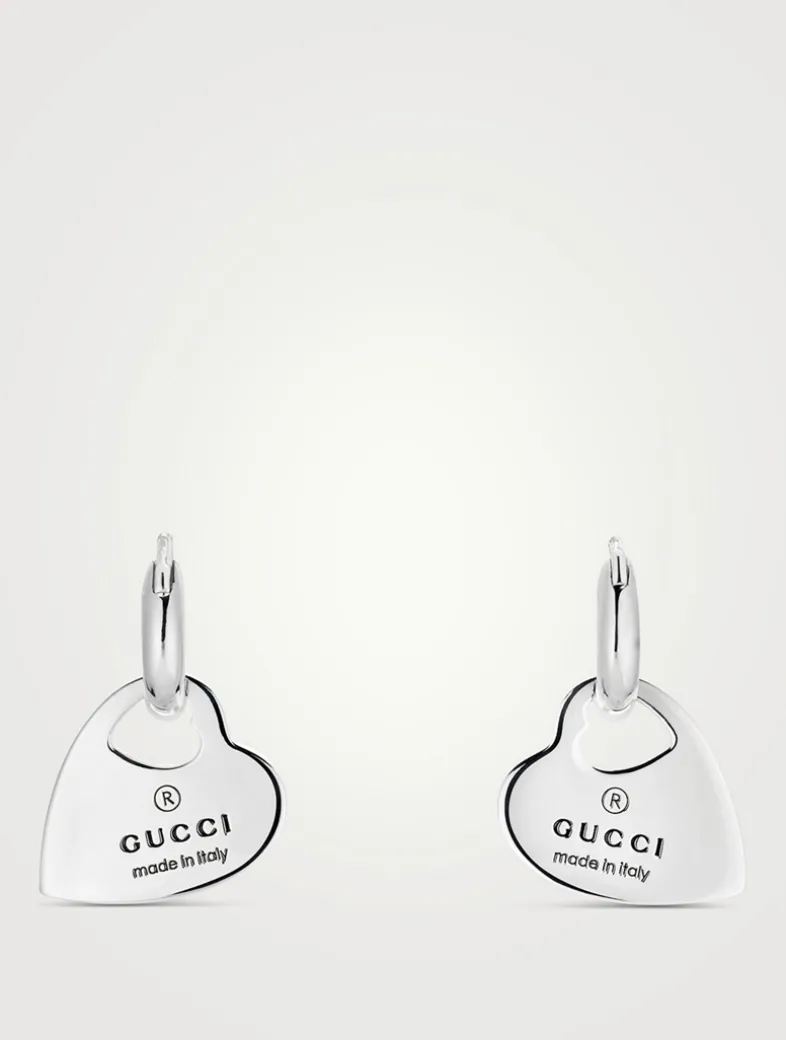 For pierced ears, this pair of delicate hinge hoop earrings feature a cut-out heart within a signature heart pendant. Finished with Gucci Trademark engraving.