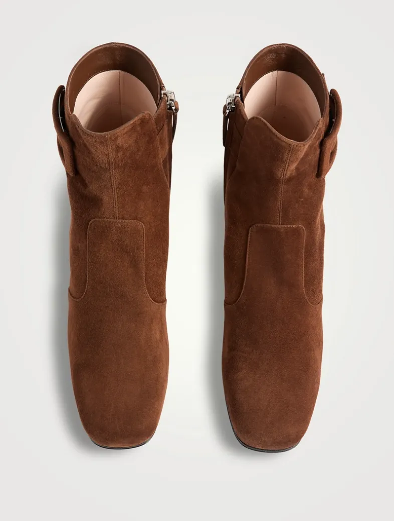 Reminiscent of the Sixties, the Très Vivier style has become an icon, sophisticated and comfortable at once thanks to the geometric heel. Crafted in suede, these booties come with an elegant covered buckle.