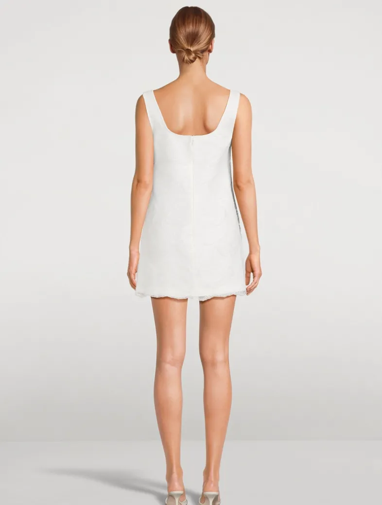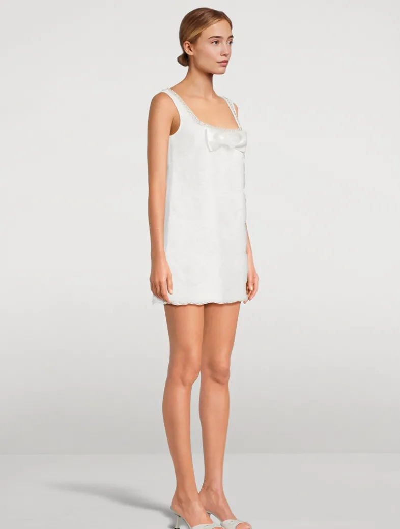 Designed for the dance floor, this floral-detailed mini’s vintage-inspired shift silhouette is topped with crystal beaded trims and an oversized bow with rosette.