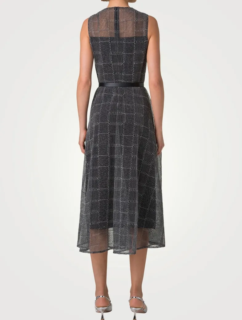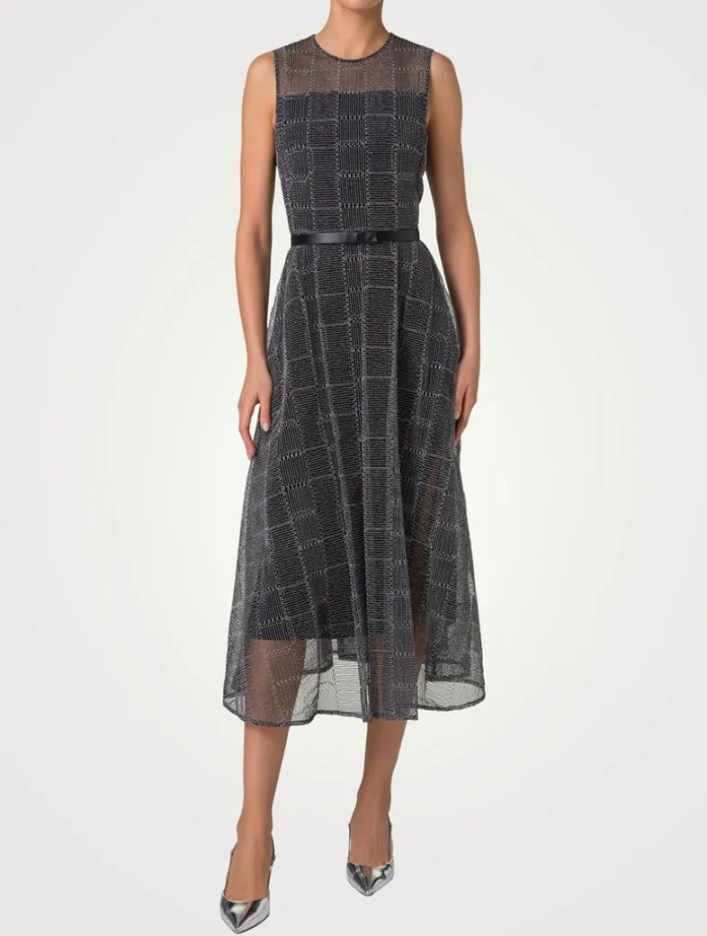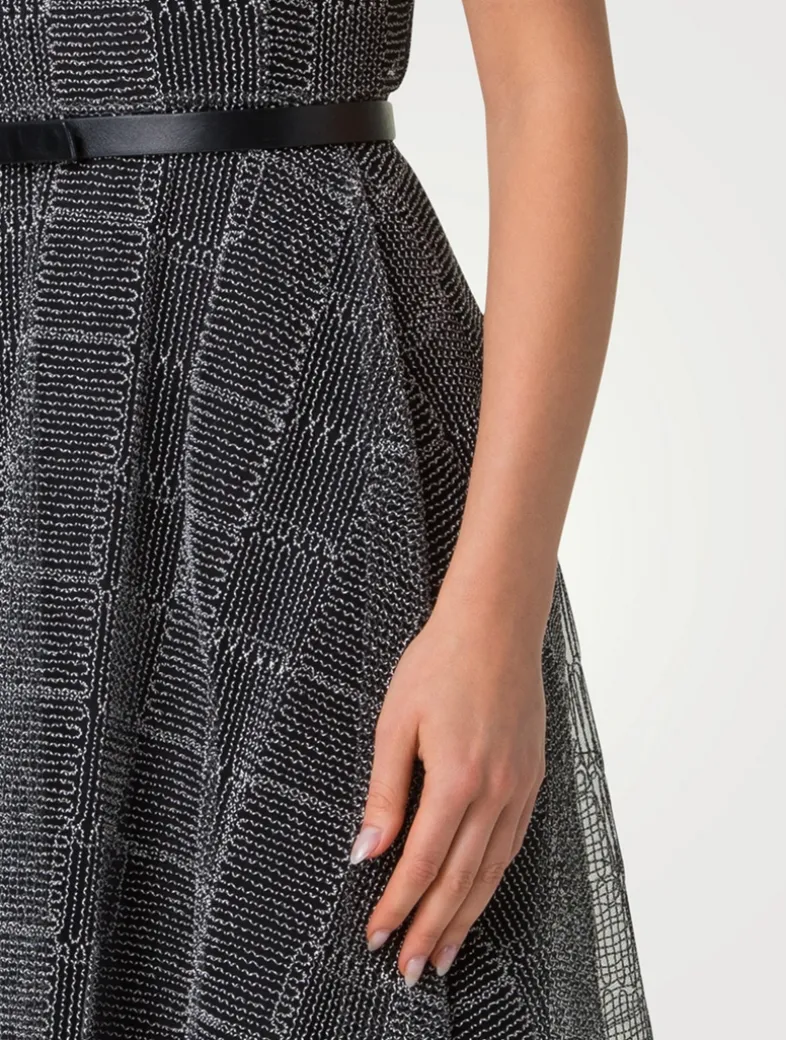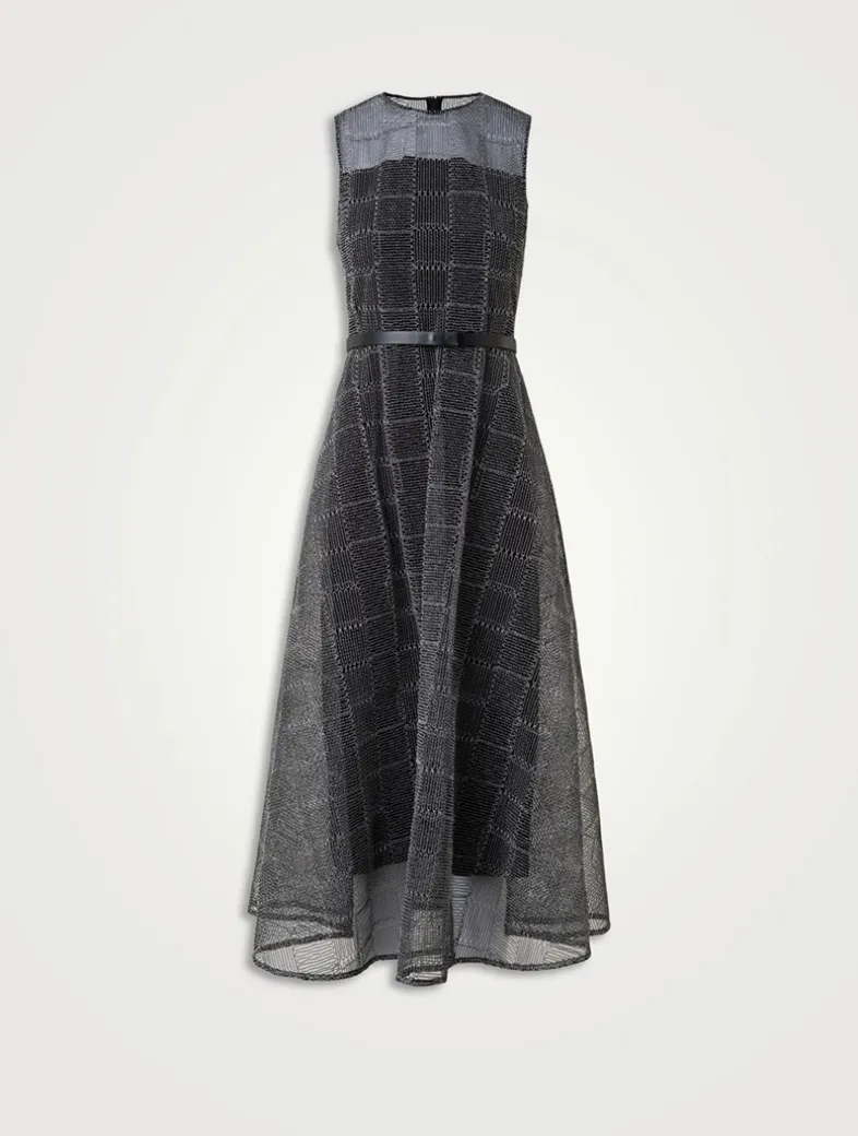 Designed with an elegant tulle overlay adorned with a square-pattern embroidery, this sleeveless midi dress features a rounded neckline and flattering flared skirt. Finished with a sleek, waist-cinching belt and a back zipper closure.