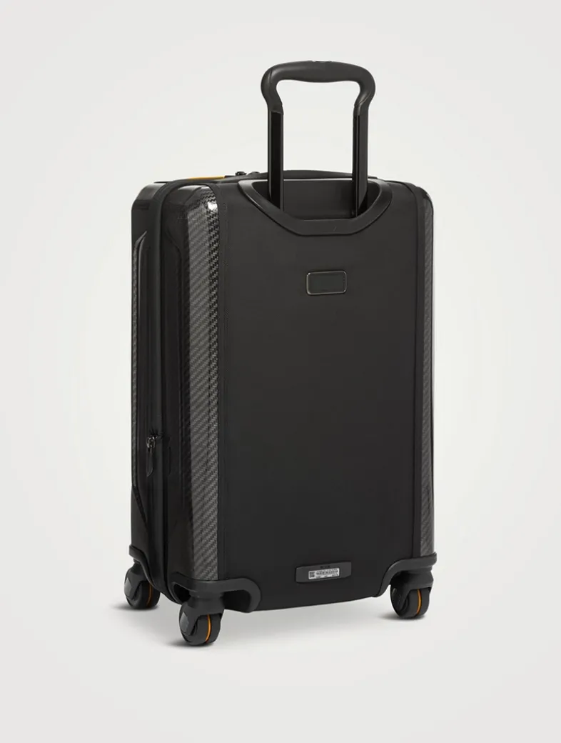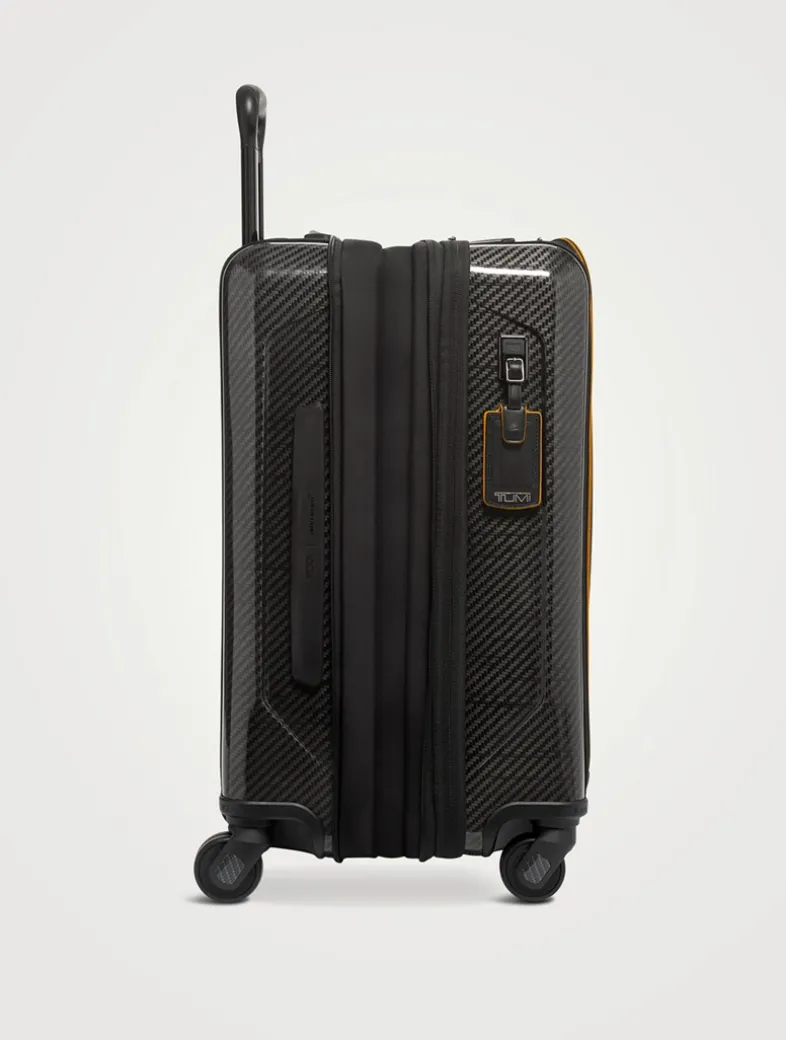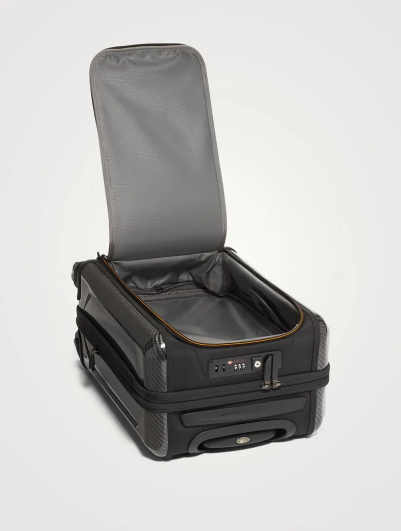 A part of the TUMI | McLaren 60th Anniversary Collection, this carry-on features CX6 carbon fiber accents, compression straps and signature MCLAREN papaya highlights. Detailed with a front-lid/split-case zip entry, this carry-on is finished with retractable top and side carry handles, built-in combination TSA lock, zip expansion, four-dual spinner wheels and a built-in USB port (power bank not included).