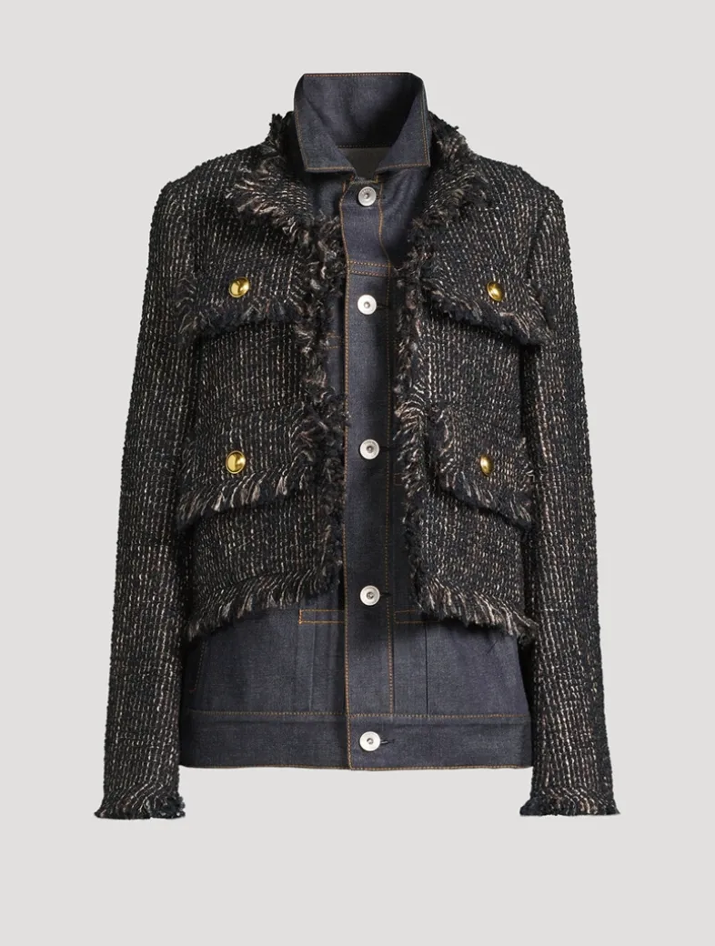 Flaunting a mixed-media design, this jacket has a classic topstitched denim collar, placket, and hem paired with nubby tweed sleeves and body finished with fringe trim.
