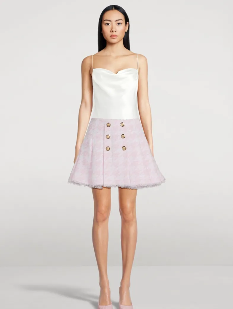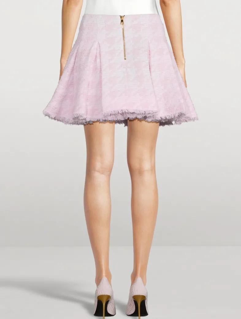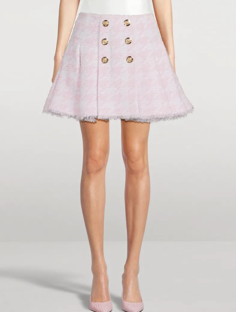 Crafted in a textured cotton-blend tweed, this mini skirt has a wrap design embellished with embossed gold-tone buttons at the front. It is finished with an exposed back zipper and cut in a flared silhouette.