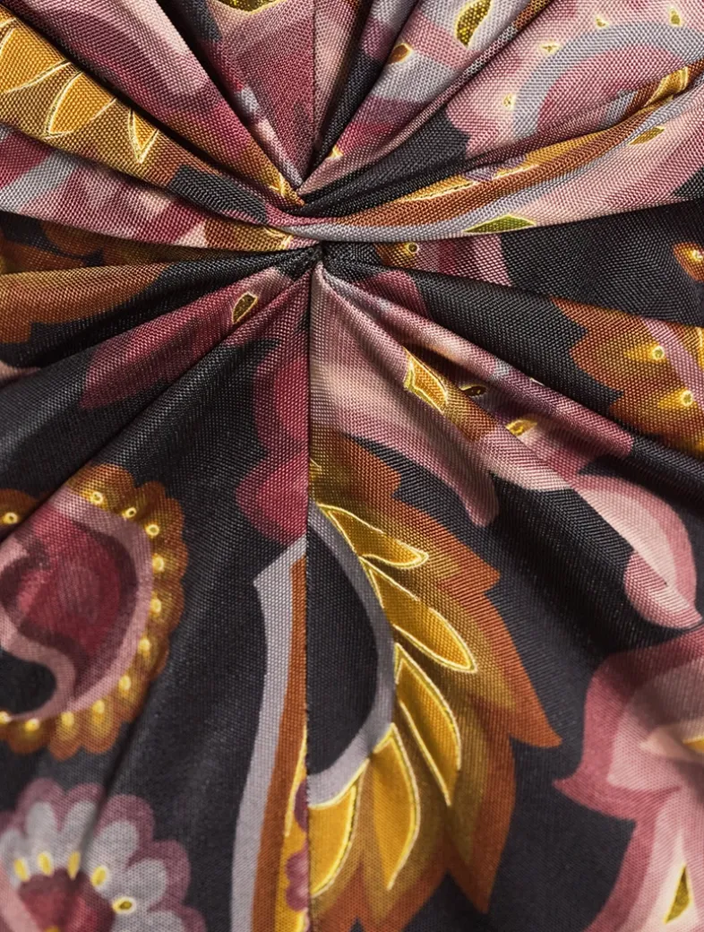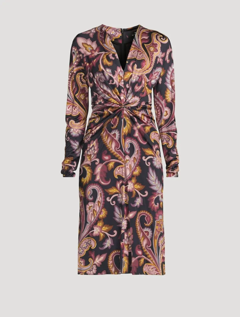 Made in Italy, this stretch jersey dress is adorned with a decorative paisley print. It is cut in a curve-skimming silhouette with long sleeves, a V-neckline, and a twisted detail at the front waist.
