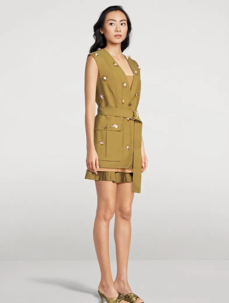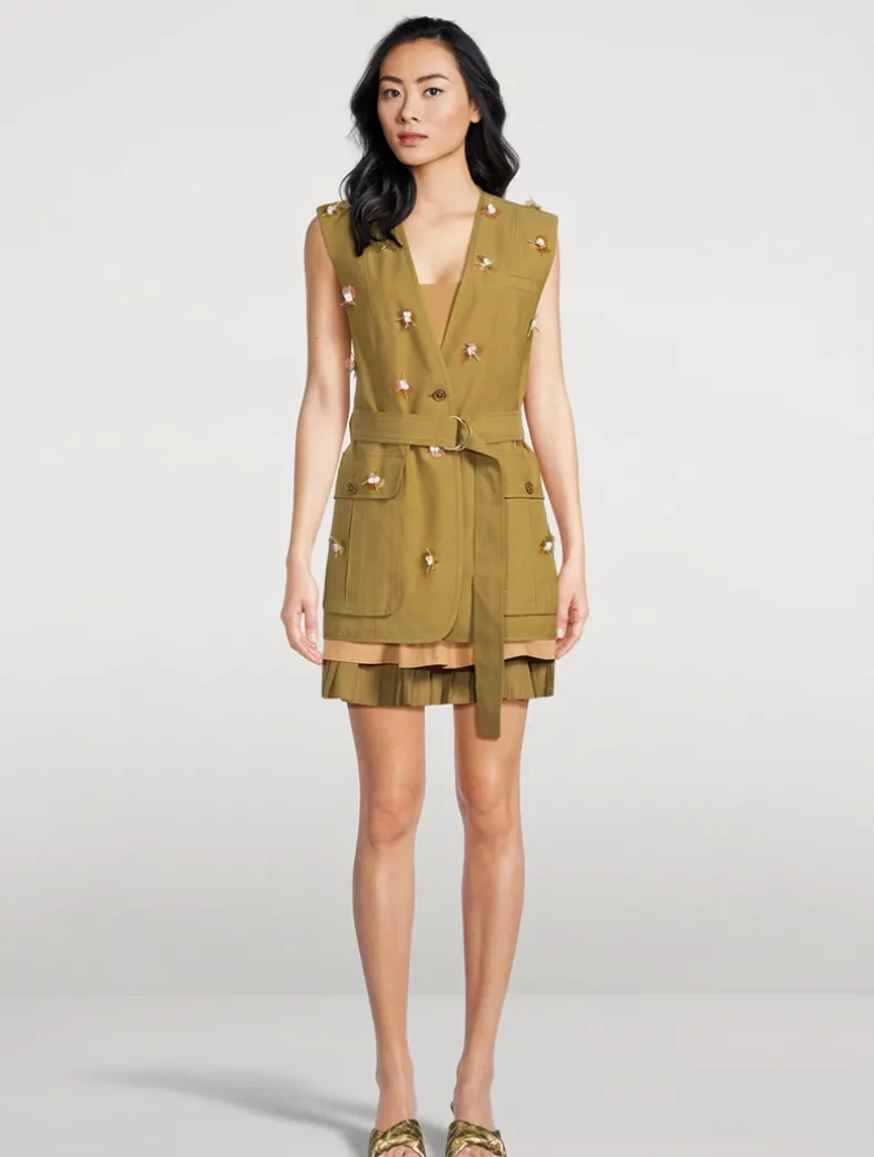 The Twyla Vest is tailored from cotton twill that’s blended with Tencel for a soft hand. This utilitarian piece has a beautifully fitted silhouette and is playfully sprinkled with paillette florals embroidered by hand. It has oversized patch pockets and a belt to cinch the waist.
