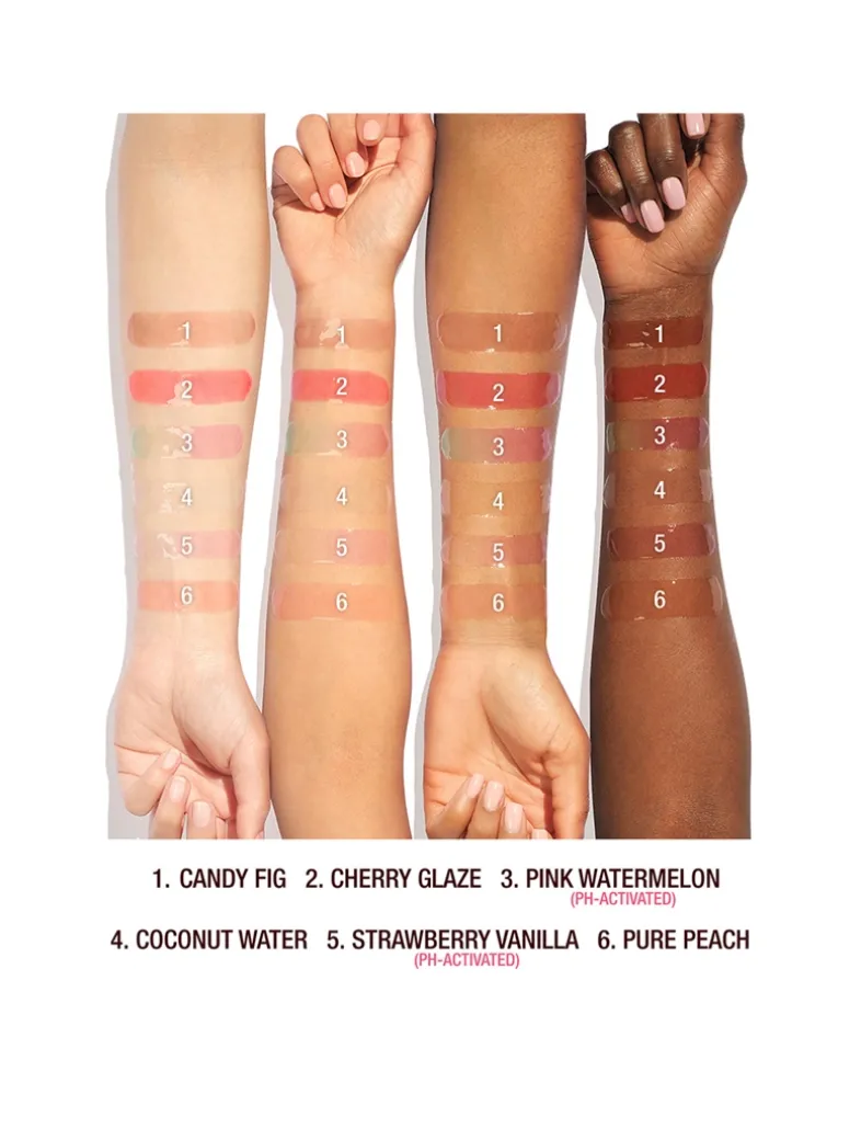 A hydrating lip oil that leaves a glossy, glass-like finish for juicy lips in one swipe! The lip-hugging applicator perfectly contours your lips! Experience the cushioning comfort of a nourishing balm and the glow glide of an oil with a blend of skin-barrier boosting ingredients, designed to play with the light to make your lips look plump in just one swipe! Available in 6 shades, 2 with pH technology to enhance your natural lip color!