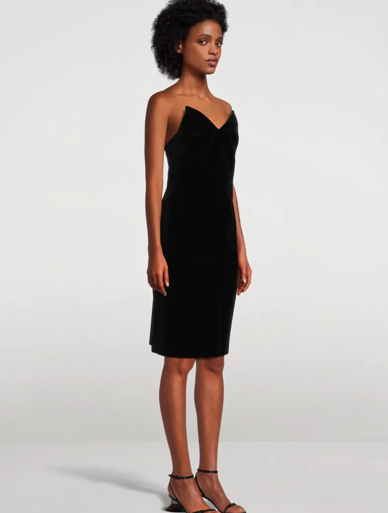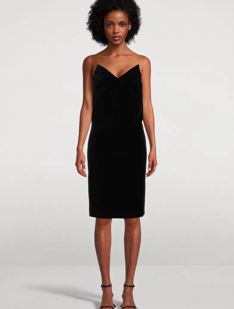 This knee-length velvet dress is constructed with peak detailing at the neckline for a timeless bustier silhouette. Featuring a column fit, this strapless dress is finished with a zip fastening on the back.