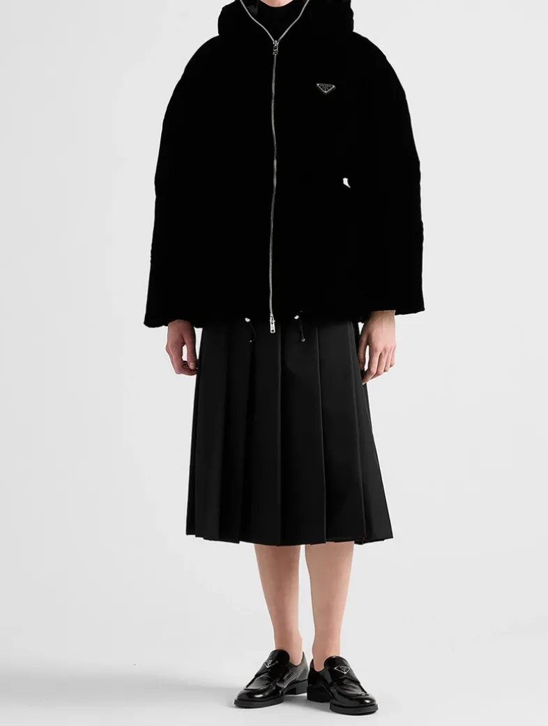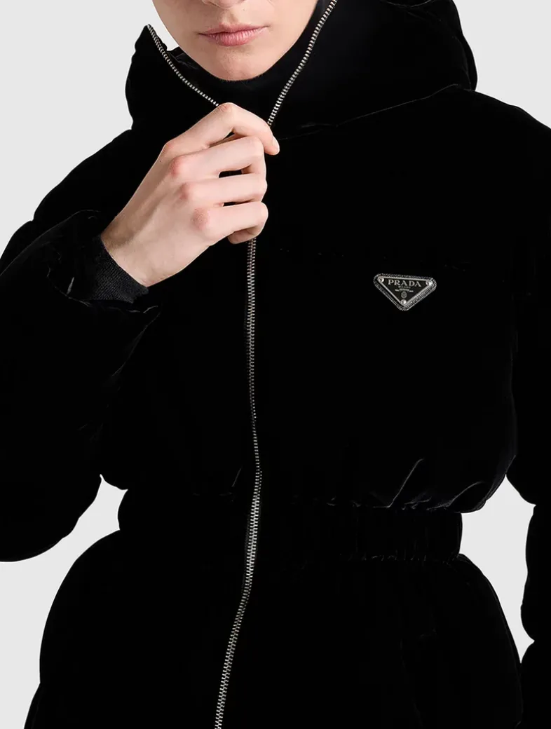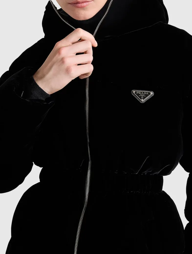 Regular Goose down padding With hood Long sleeves Straight cuff Zipper closure Welt zipper pockets Elasticized drawstring on the hem and hood Enameled metal triangle logo Elasticized waist