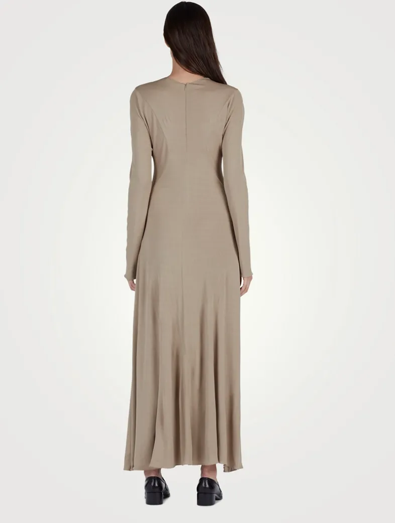 Embellished with tonal silk trims, this long-sleeve maxi dress is detailed with a roundneck, hidden back zip fastening, and flowy A-line skirt. Finished in a slim-fitting silhouette.