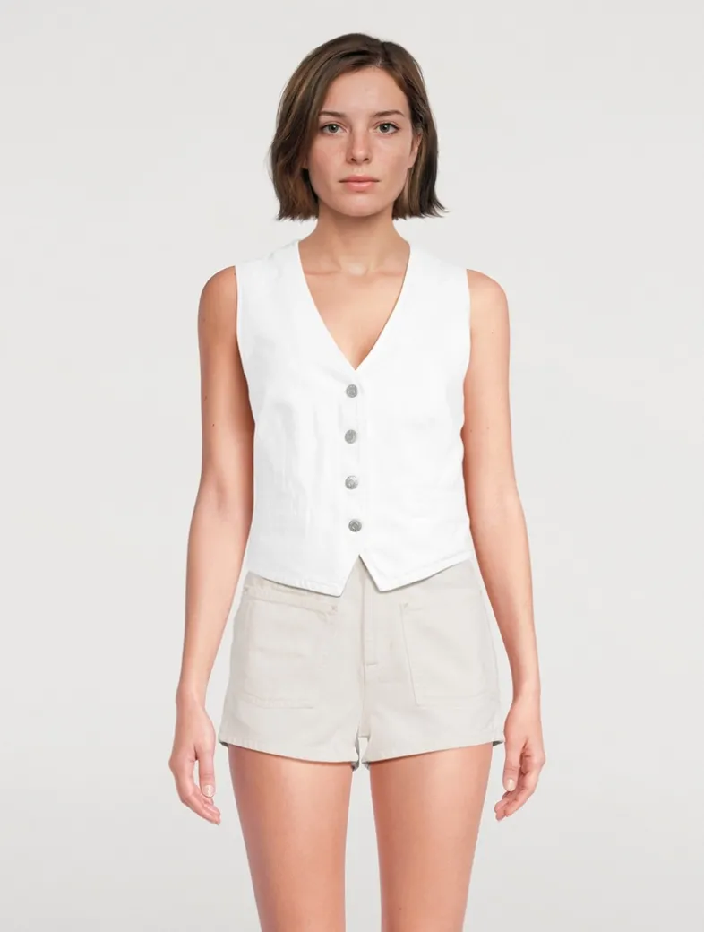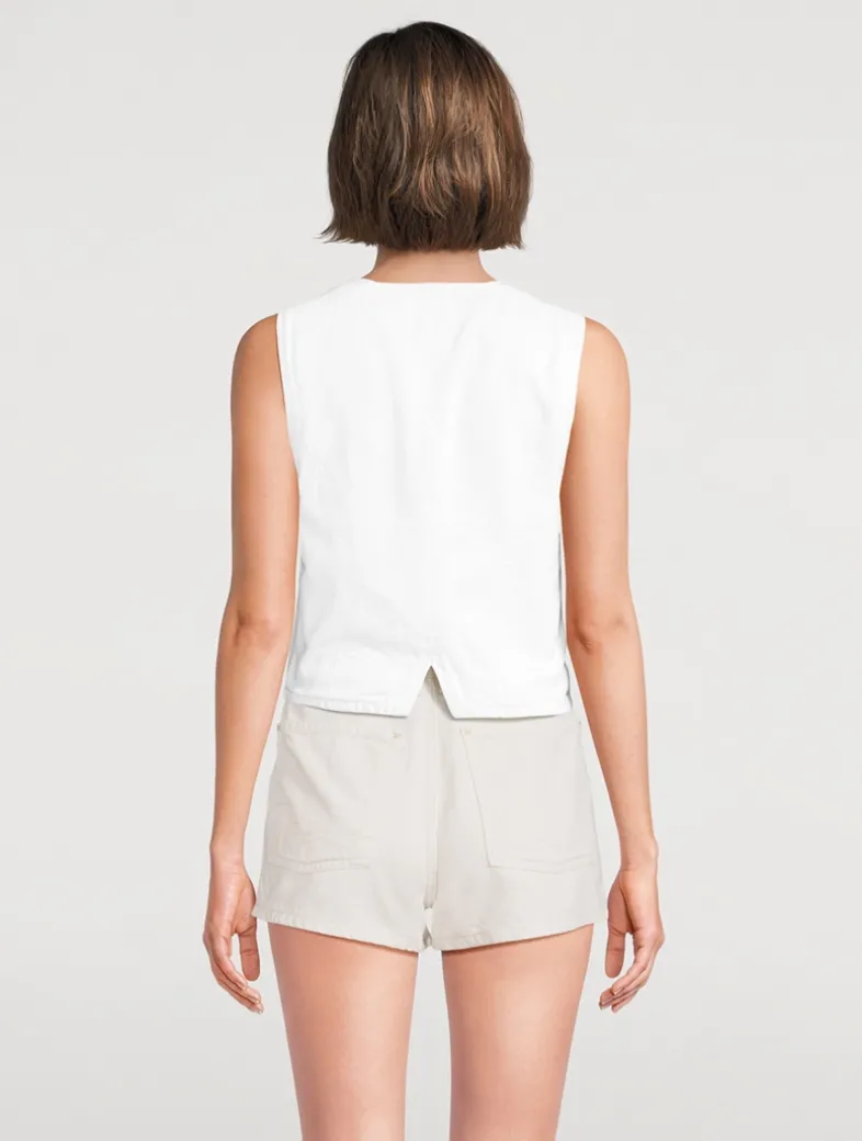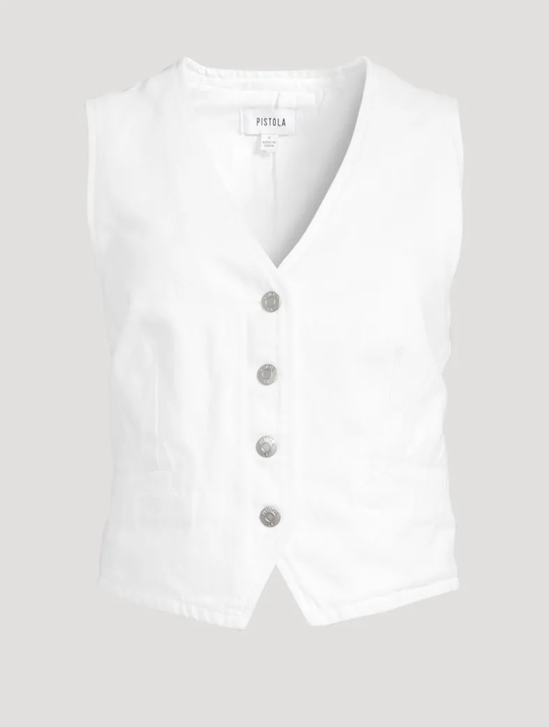 This fitted denim vest has a flattering silhouette and cropped length to create a sleek look.