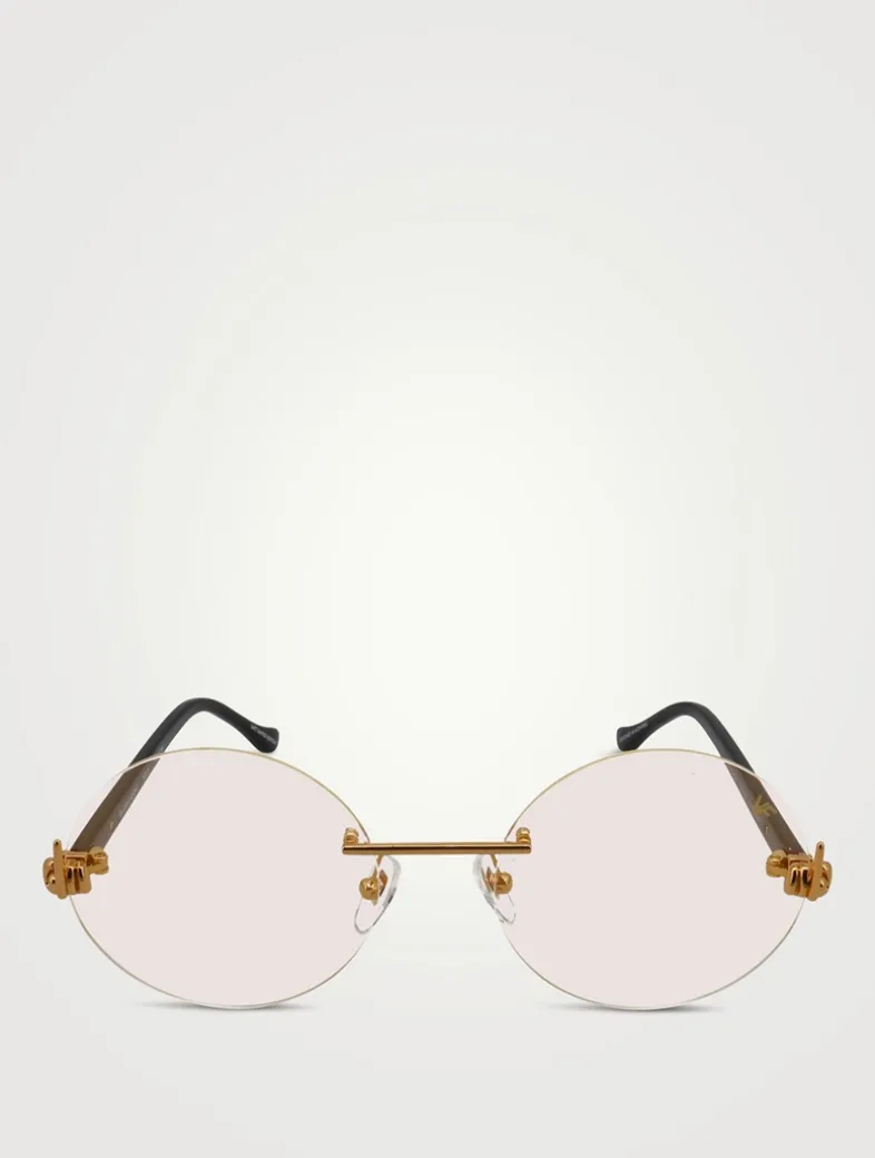Crafted with round, rimless lenses, these statement sunglasses feature the brand’s classic 24k gold drill mount paired with their FU hardware and acetate arms.