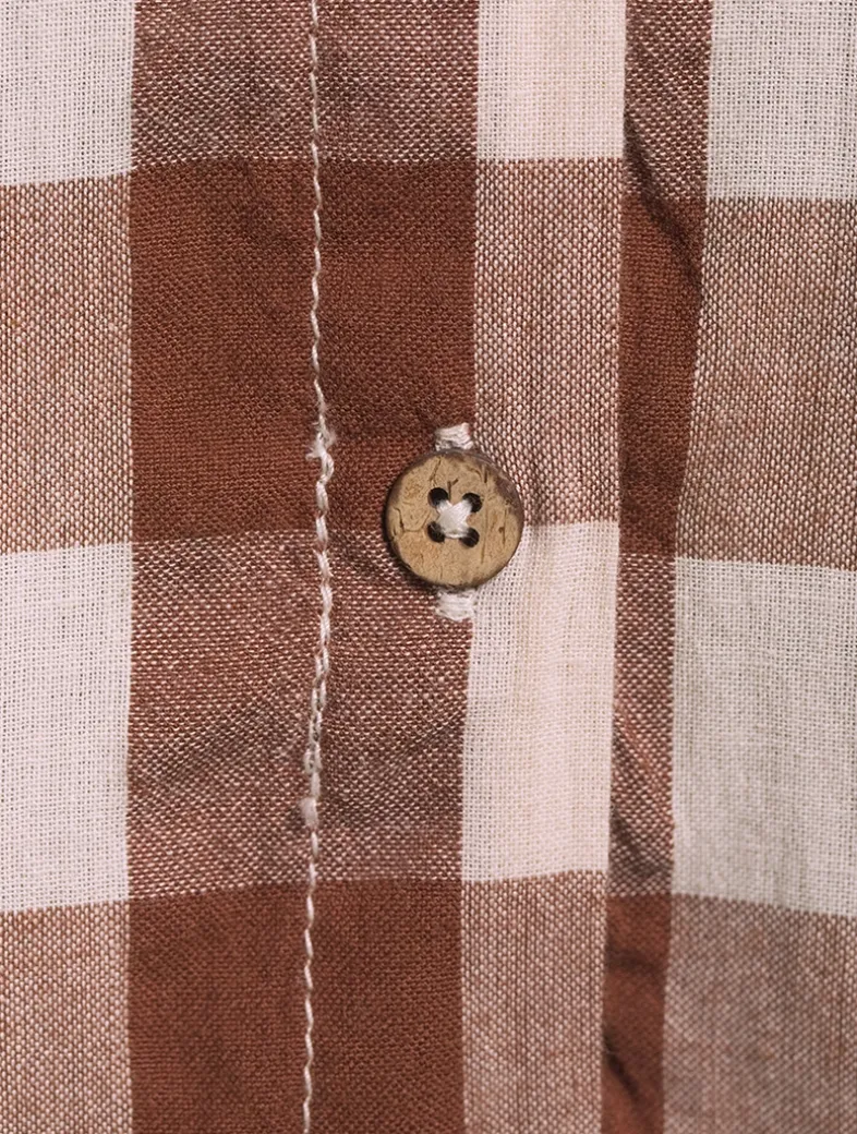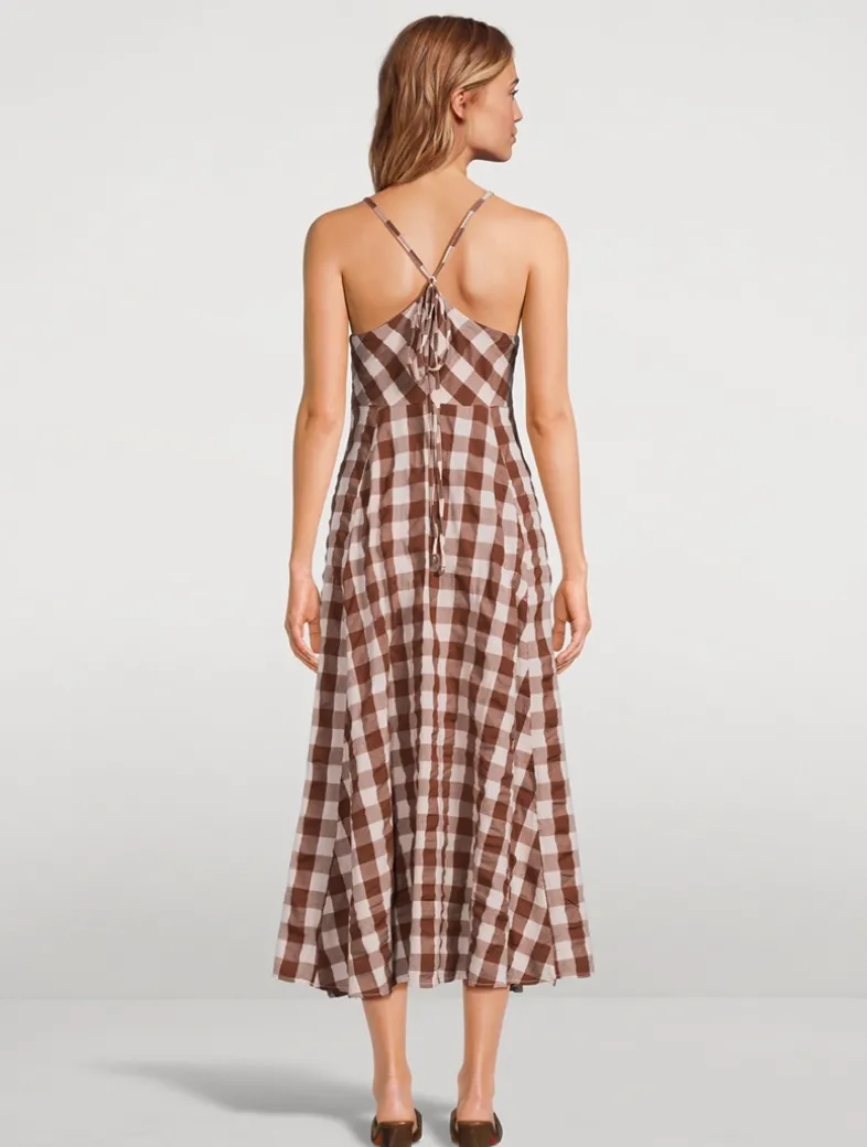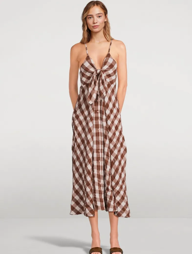 This effortless midi dress is featured in a classic checked print with a defined bowtie at the neckline and button-front closure for multiple ways to wear. Crafted from soft cotton, it has a V-neckline, side pockets, and adjustable straps that tie at the back.