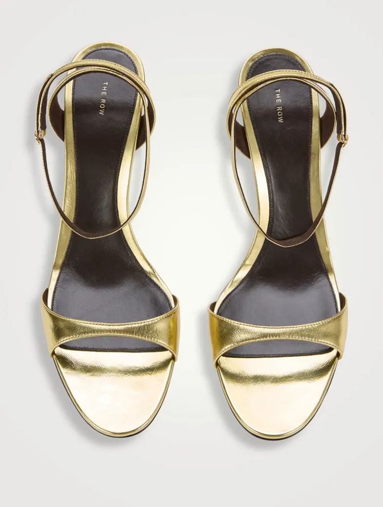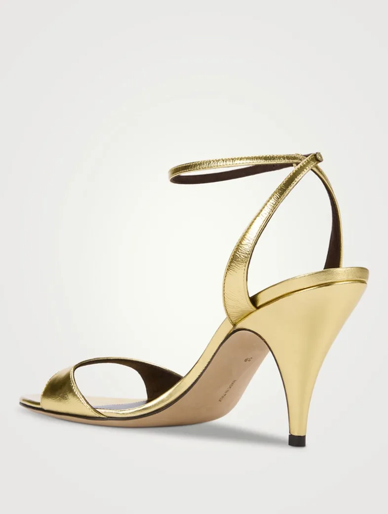 Made in Italy, these refined heeled sandal in soft metallic leather are designed with a delicate buckled ankle strap and tapered high heel.