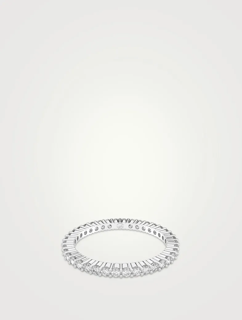 A slim band is graced by a complete circle of gems in this SWAROVSKI ring. Round cut cubic zirconia glitter in this classic ring, set in rhodium plated metal.