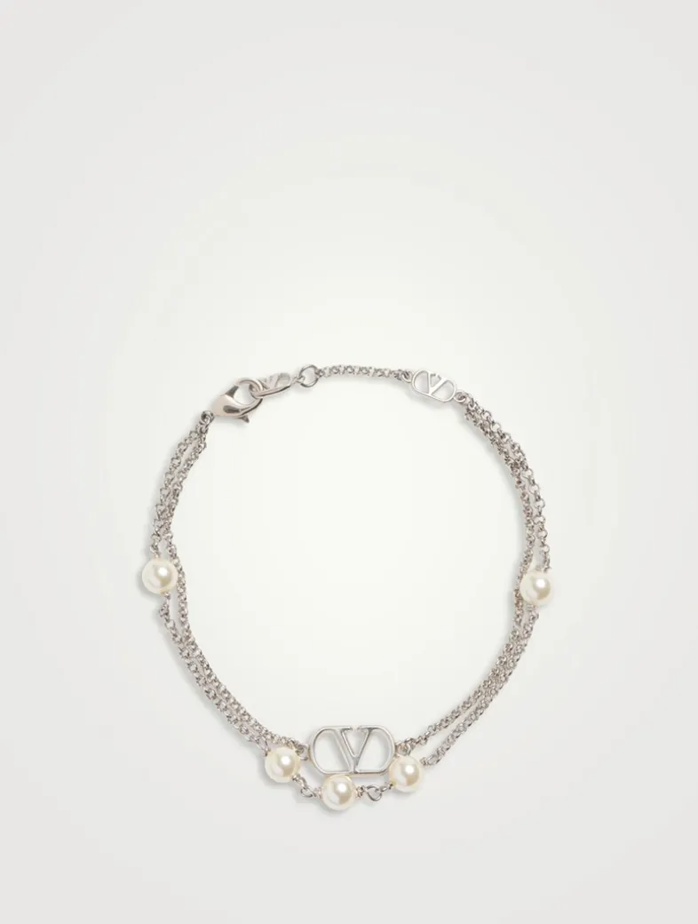 VLogo And Faux Pearl Double-Chain Bracelet