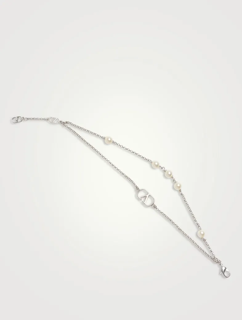 This double-chain bracelet features a palladium-tone finish, accented with VLogo and Swarovski® Pearl details.