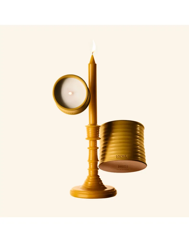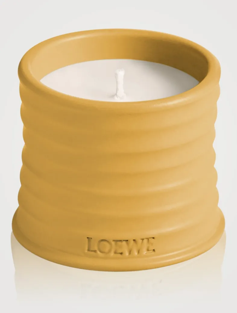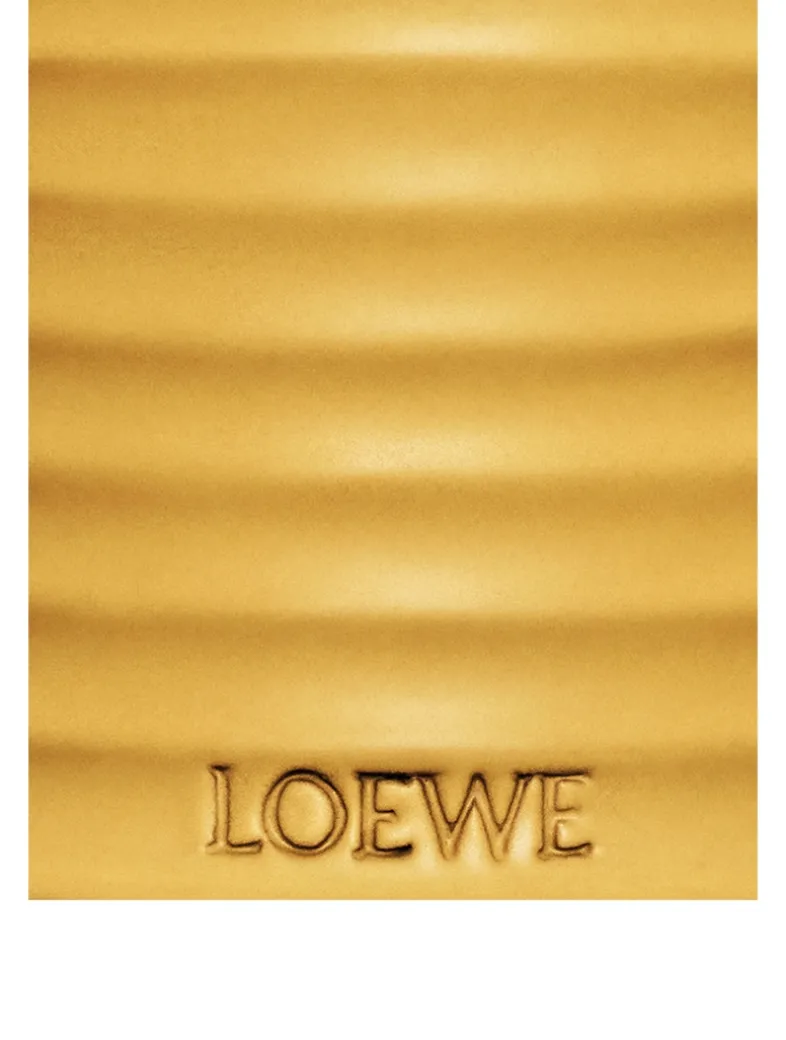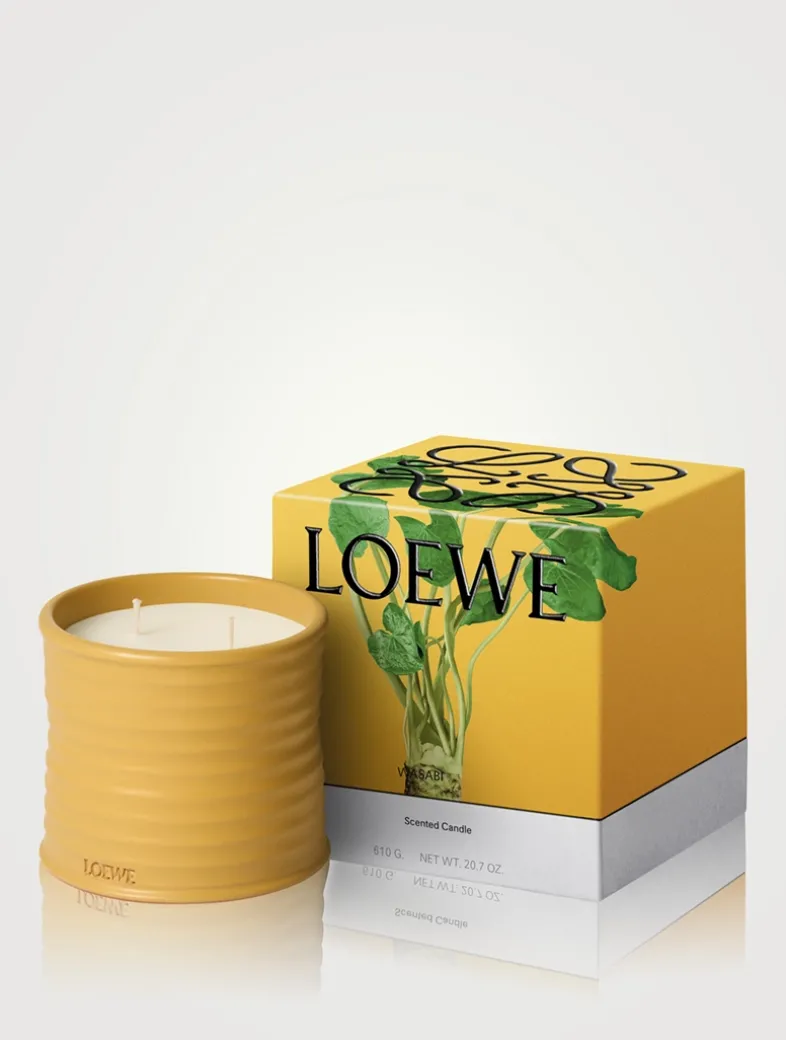 The Wasabi scented candle has a high-intensity fragrance with a green, spicy aroma evocative of wasabi—the Eutrema Japonica plant used to create a pale green paste that adds a distinctive, peppery piquancy to many dishes. The fresh, uplifting scent unfolds to reveal notes of basmati rice and lemongrass over time. Crafted in natural wax with a single cotton wick, the candle is presented in a yellow glazed terracotta vessel with a stamped base. All LOEWE Home Scents items are olfactory creations that highlight nature’s most natural and pure scents.