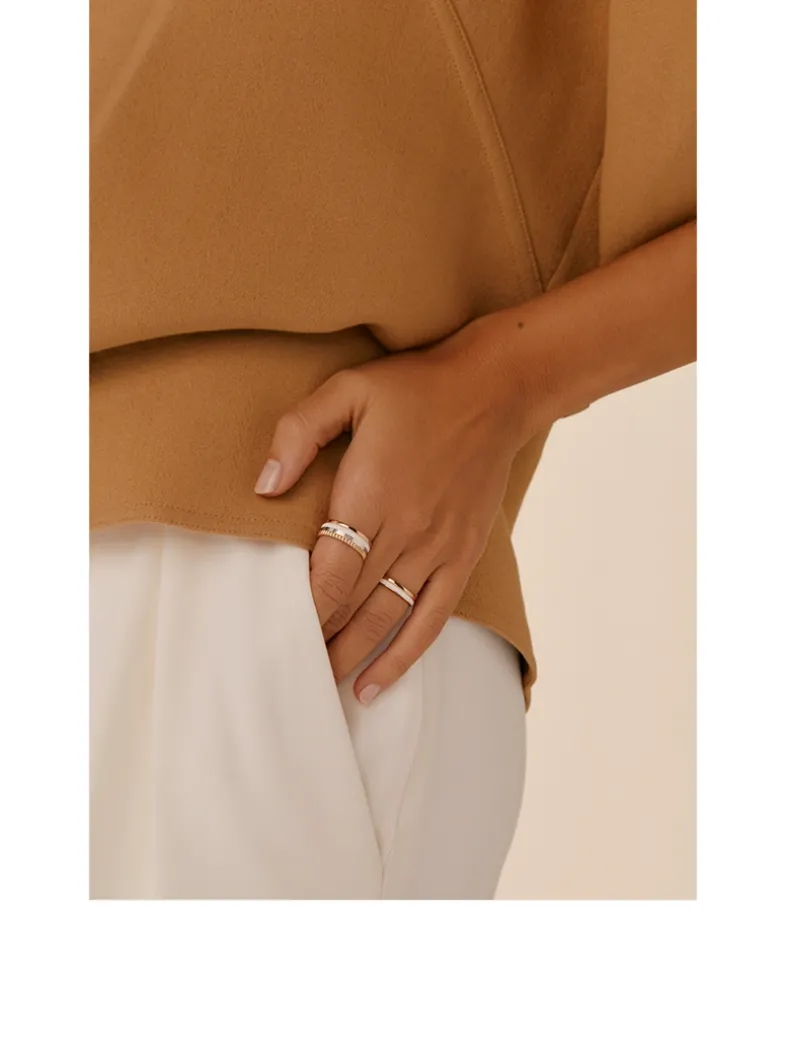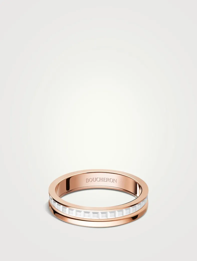 Cast in rose gold, this double-banded ring features the iconic facet motif in polished white ceramic.