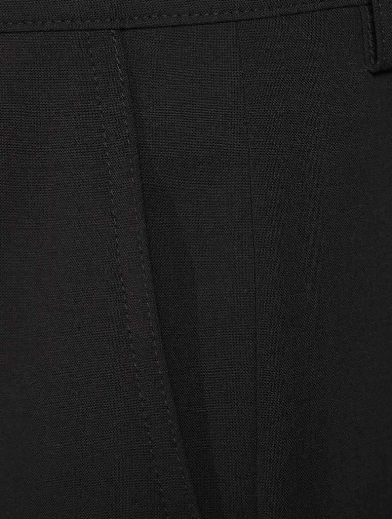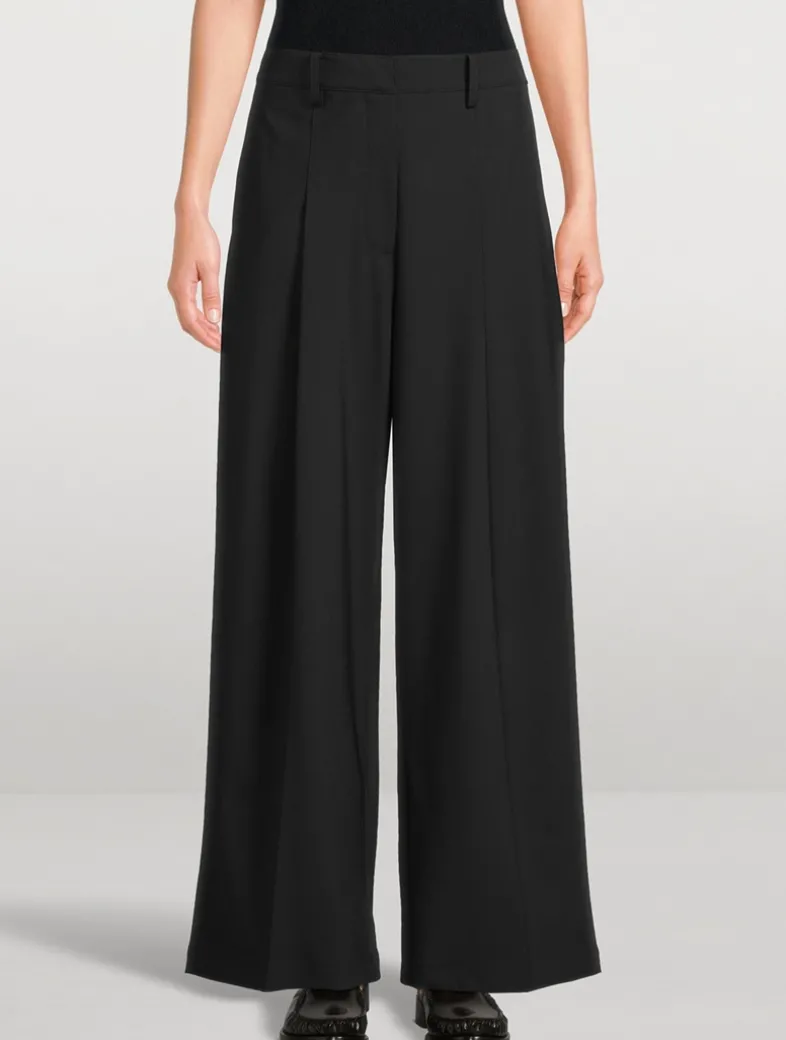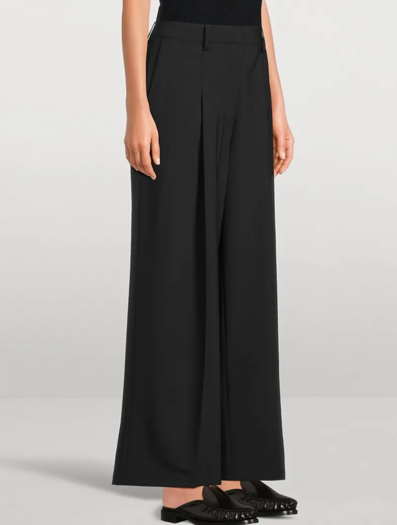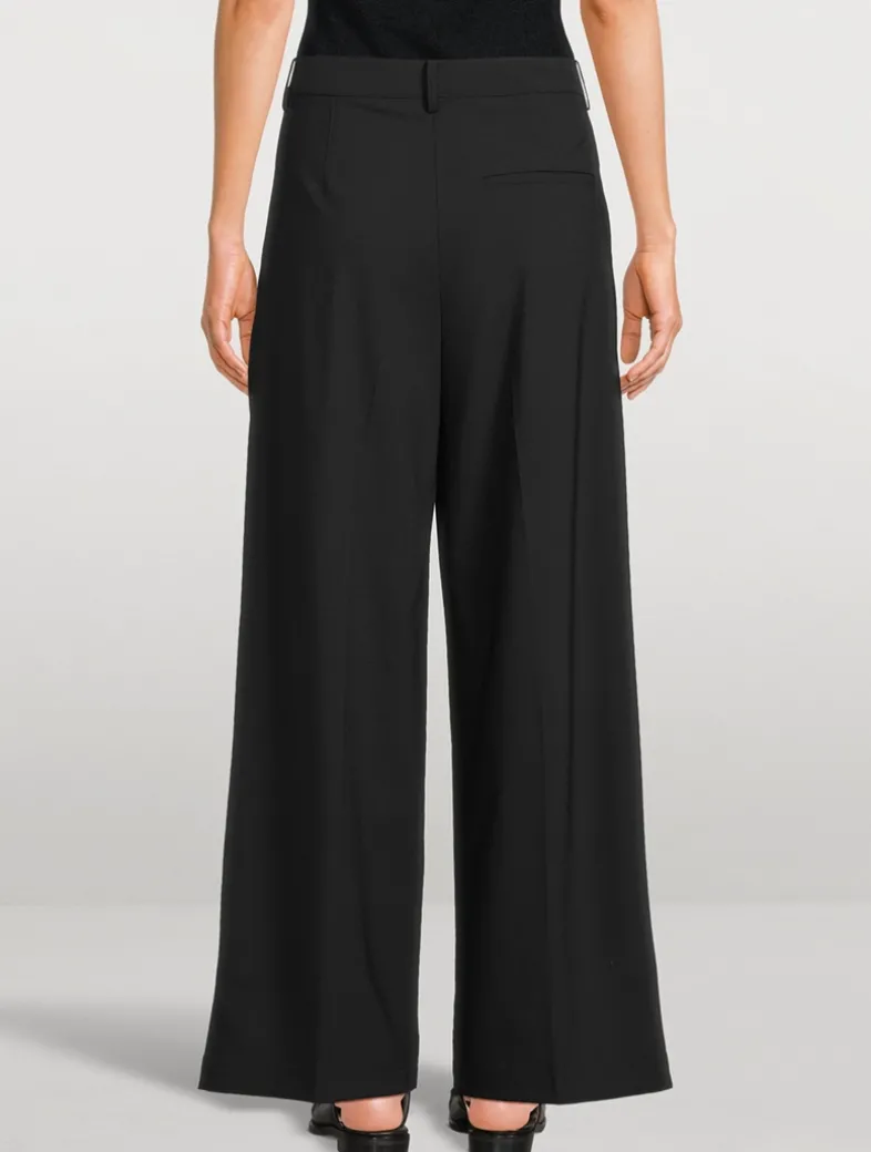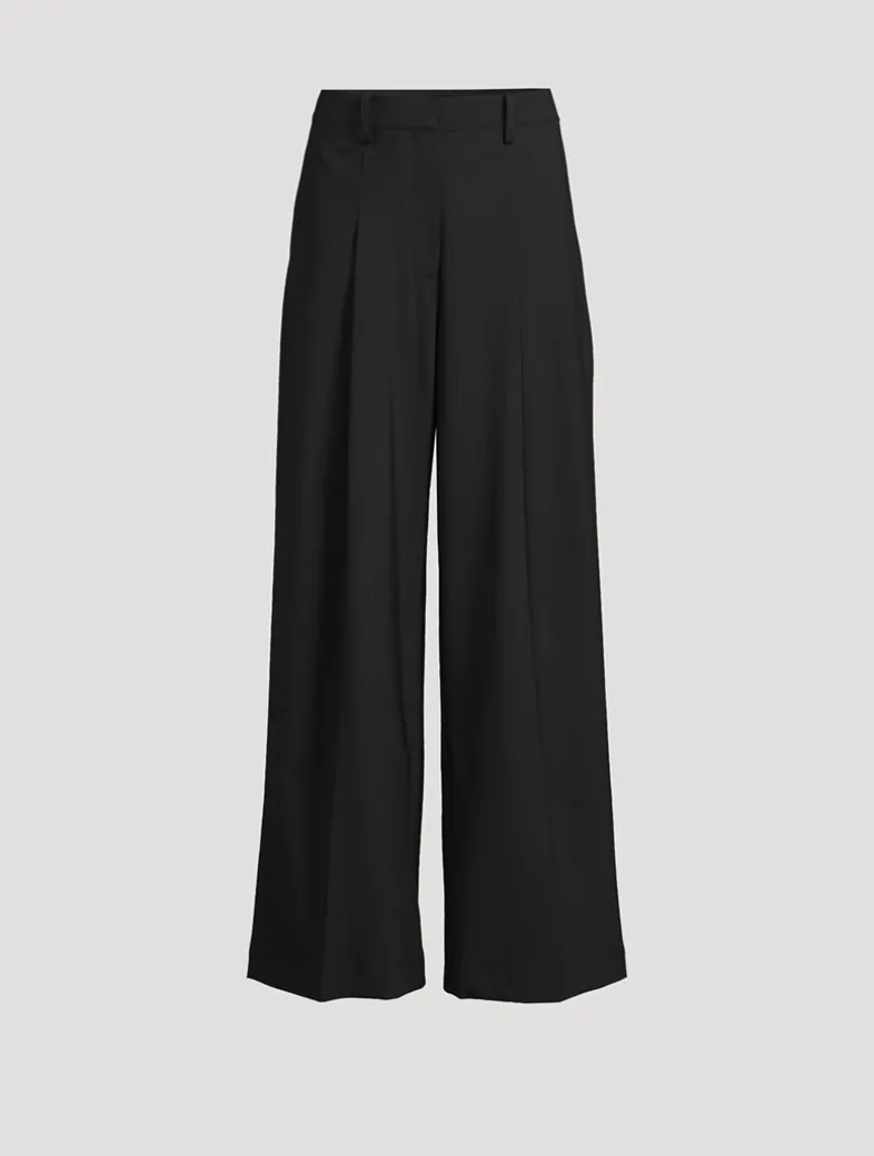 This high-waist, wide-leg trouser features a pleated front, belt loops, side pockets, a back welt pocket, and a button-zip closure, all crafted from smooth stretch wool for polished style and all-day comfort.