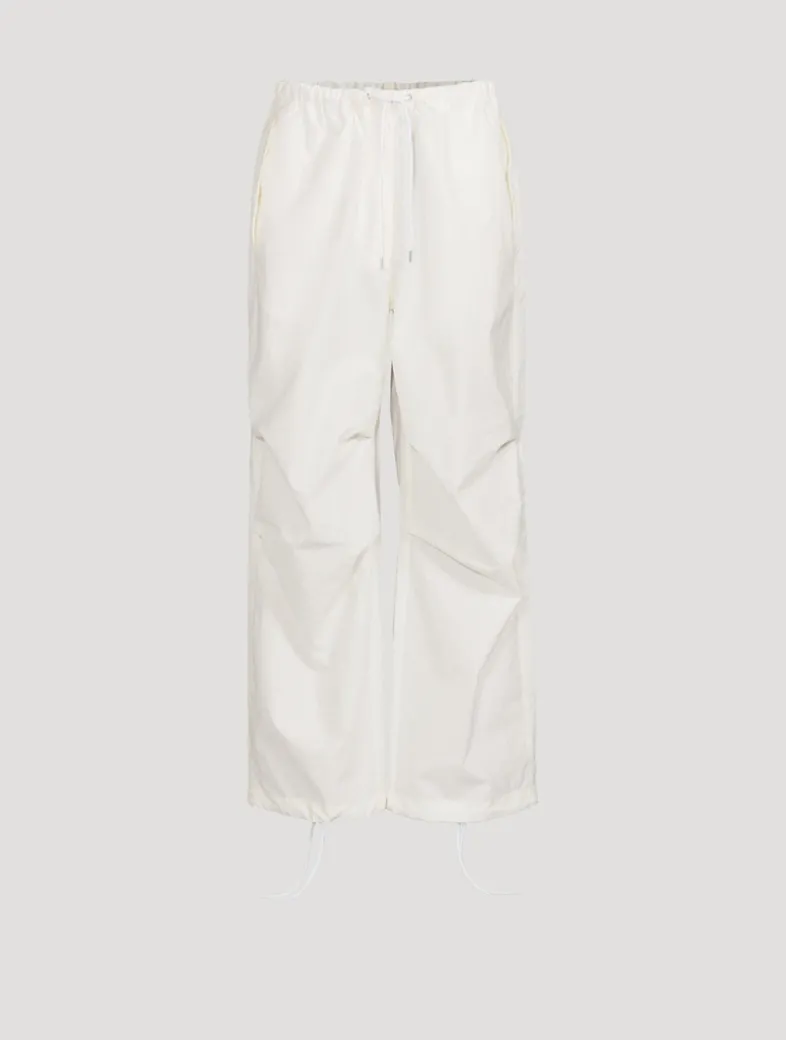 These trousers are crafted from an organic cotton blend with a soft crinkled finish, detailed with an elasticated drawcord at the waistband. They have Acne Studios logo embroidery at the back pocket. Cut to a relaxed fit with a mid-waist, baggy leg, and long length with an adjustable drawcord at the hem.