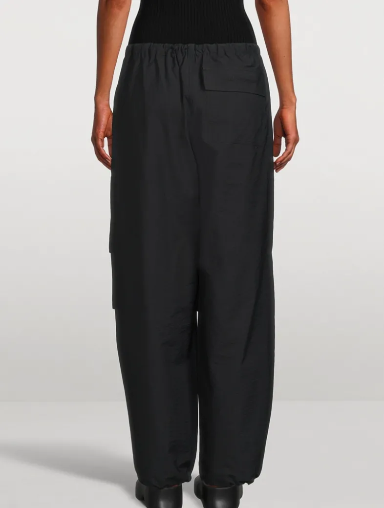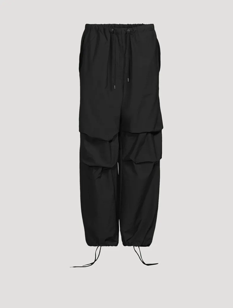 These trousers are crafted from an organic cotton blend with a soft crinkled finish, detailed with an elasticated drawcord at the waistband. They have Acne Studios logo embroidery at the back pocket. Cut to a relaxed fit with a mid-waist, baggy leg, and long length with an adjustable drawcord at the hem.
