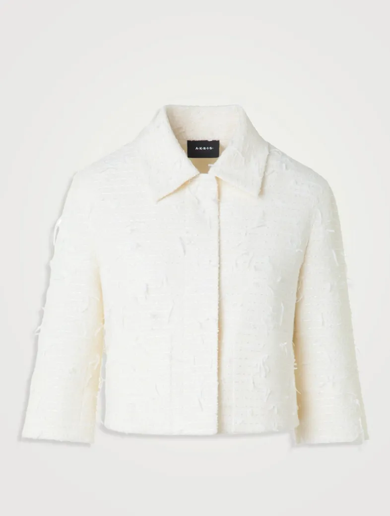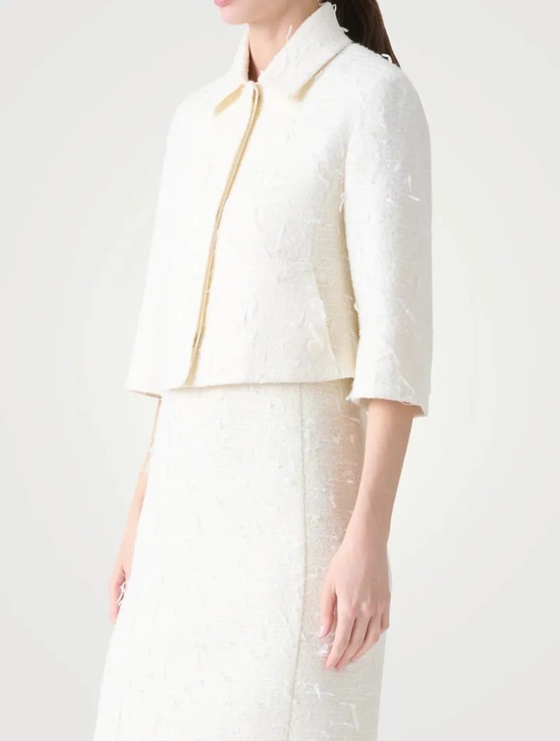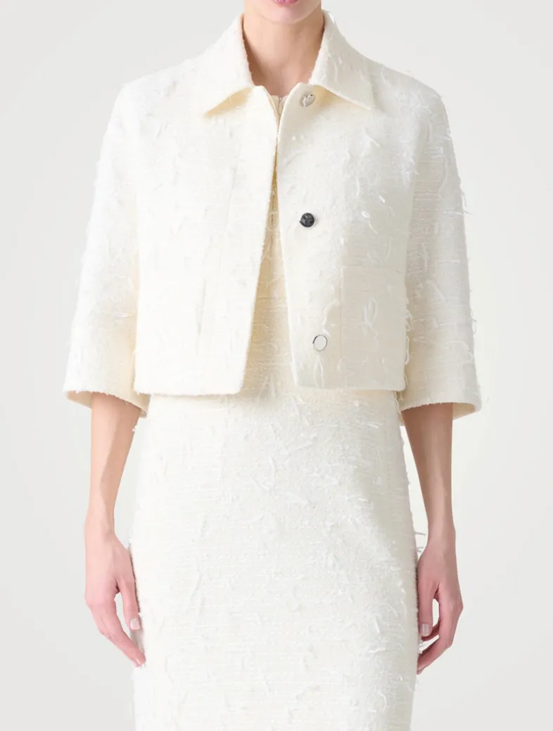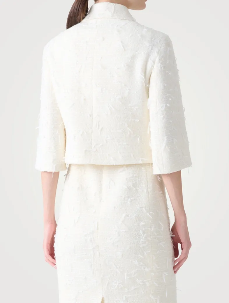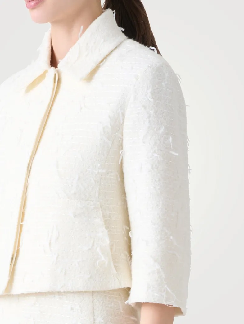 Cut to a slightly cropped length, this boxy jacket with three-quarter sleeves, patch pockets, and a concealed front closure is an office essential. It features a nubby bouclé texture.