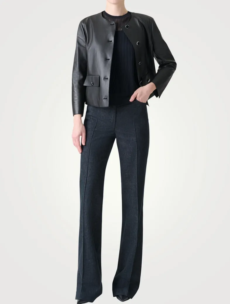 The Winter jacket is elevated by gleaming metal buttons that add a touch of sophistication. Designed with a collarless neckline, patch pockets, and bracelet-length sleeves, its structured silhouette offers timeless elegance.