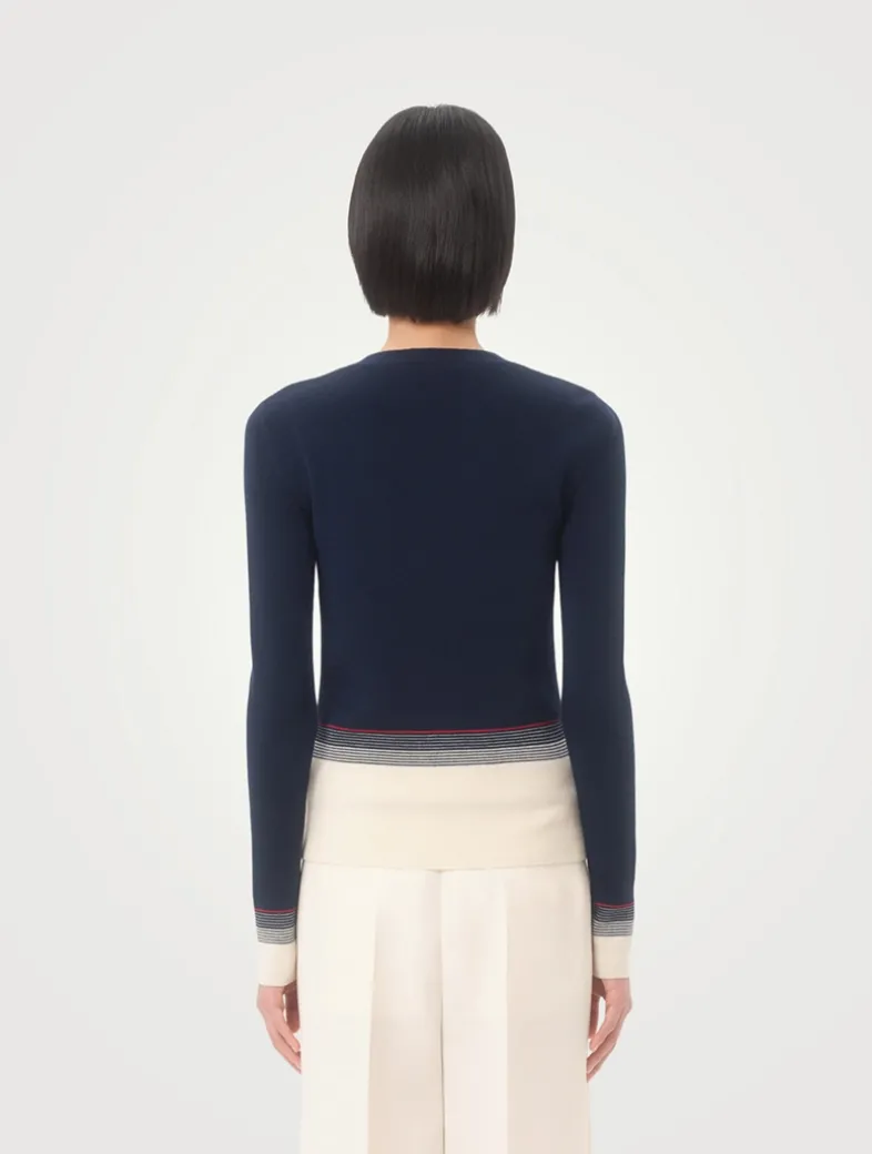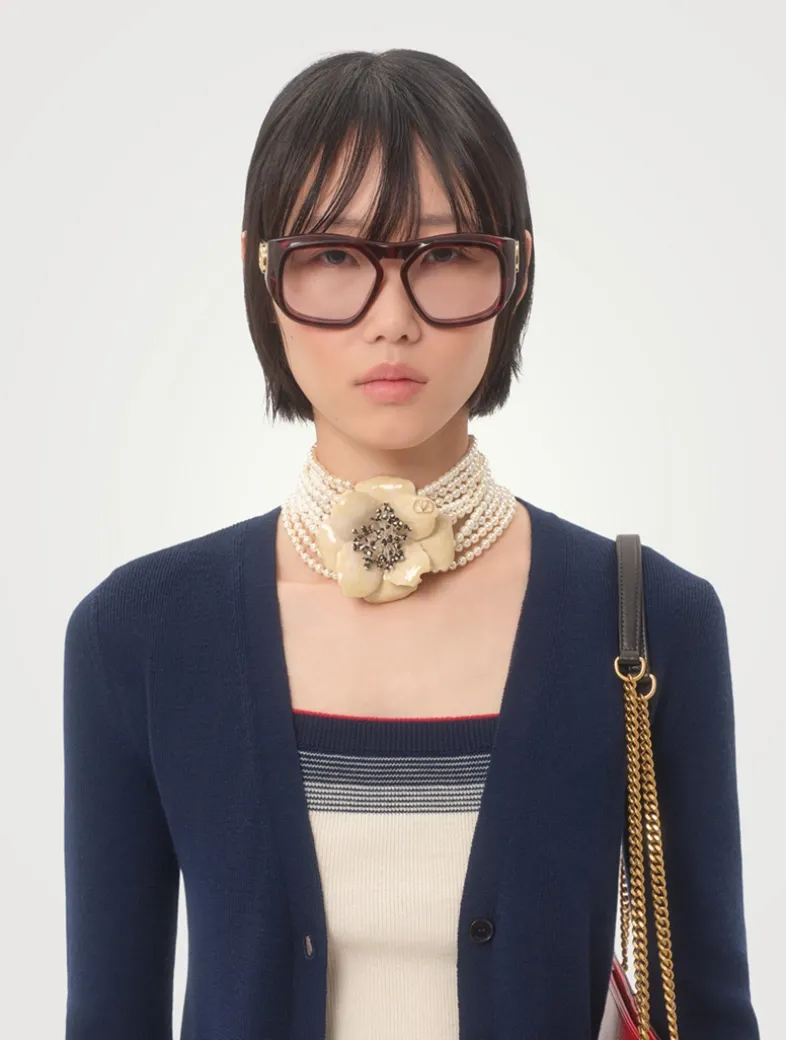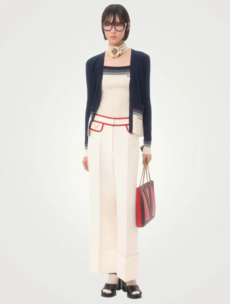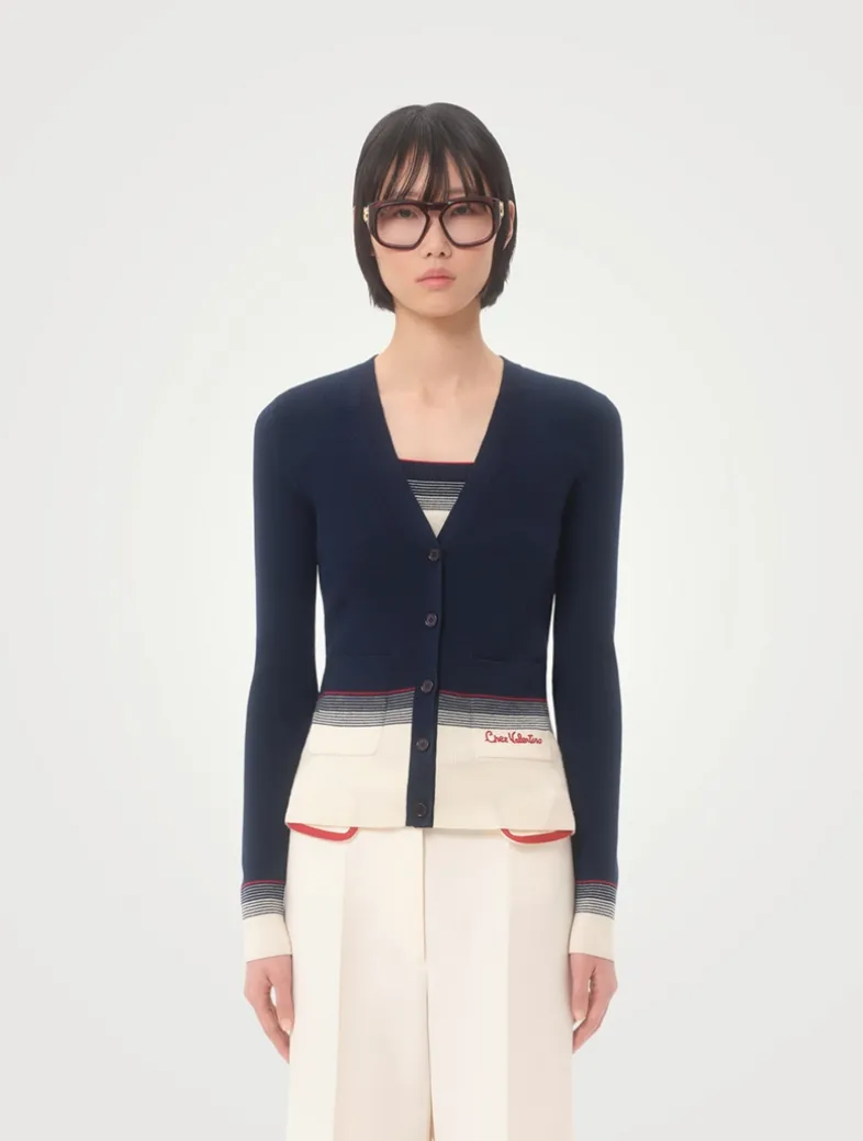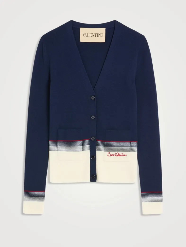 This lightweight wool cardigan is adorned with ‘Chez Valentino’ embroidery at the pocket. Cut to a fitted, V-neck silhouette, it is finished with buttons at the placket.