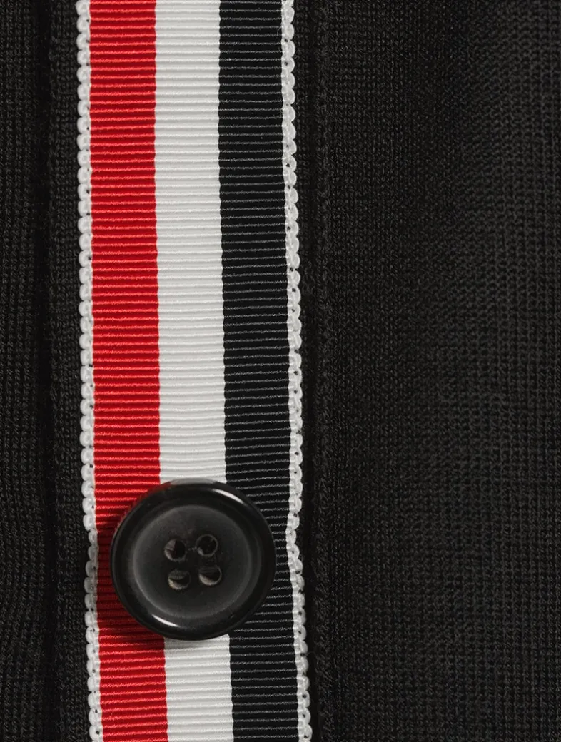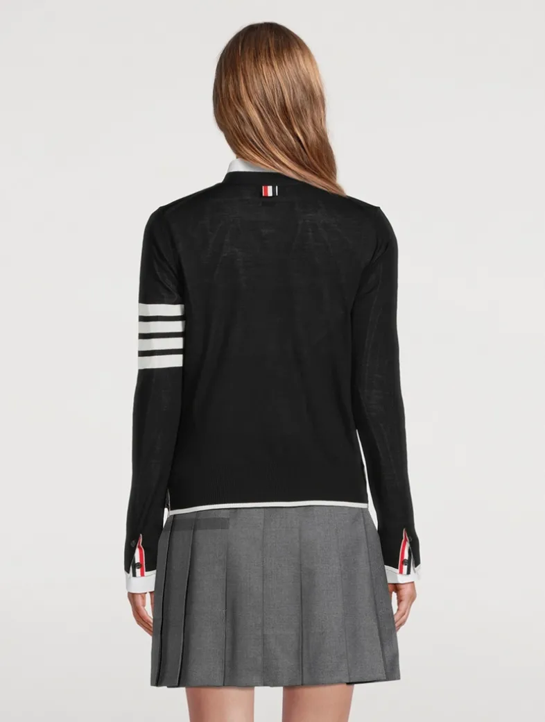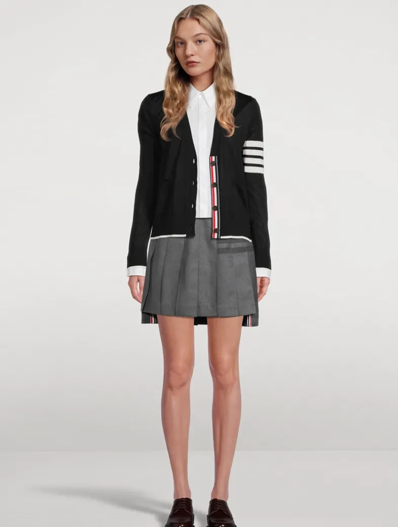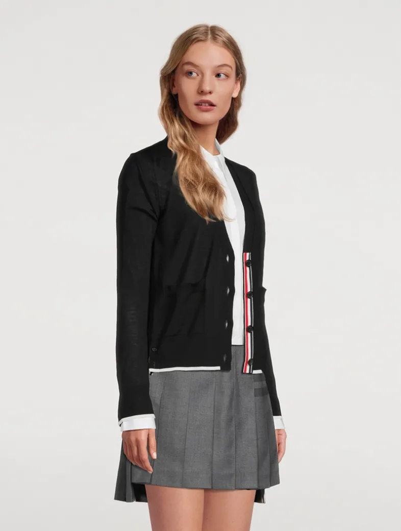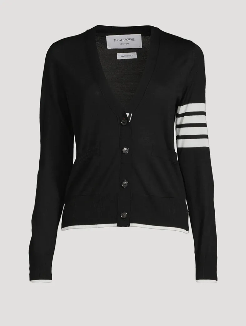 A signature Thom Browne emblem defines this classic cardigan — iconic four-bar stripes, synonymous with the brand. Presented in a breathable soft wool knit, this cardigan is a longstanding staple made with a relaxed fit for added comfort. It has a front button closure with striped grosgrain placket and buttoned cuffs and side vents with striped grosgrain trim.