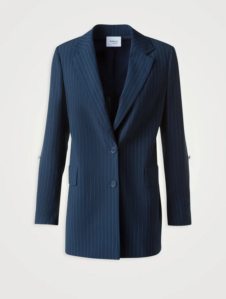 Akris Punto’s single-breasted blazer nods to menswear-inspired styles. Crafted from a cool wool crêpe, it has a classic pinstripe print and is cut to a relaxed fit with rolled sleeves and flap pockets.