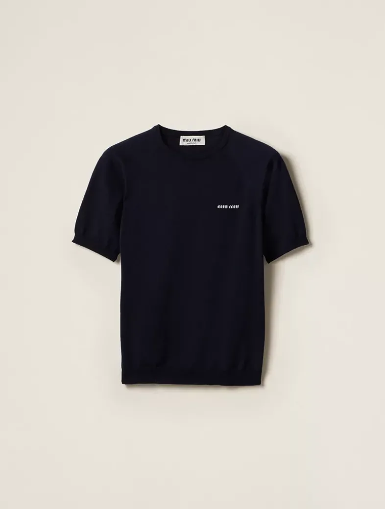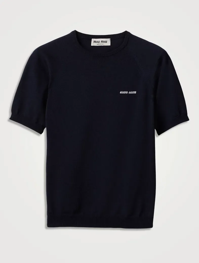 Plain knit Slim-fit silhouette Short sleeves Ribbed knit crew-neck Raglan shoulder Ribbed knit sleeve trim and hem Intarsia logo