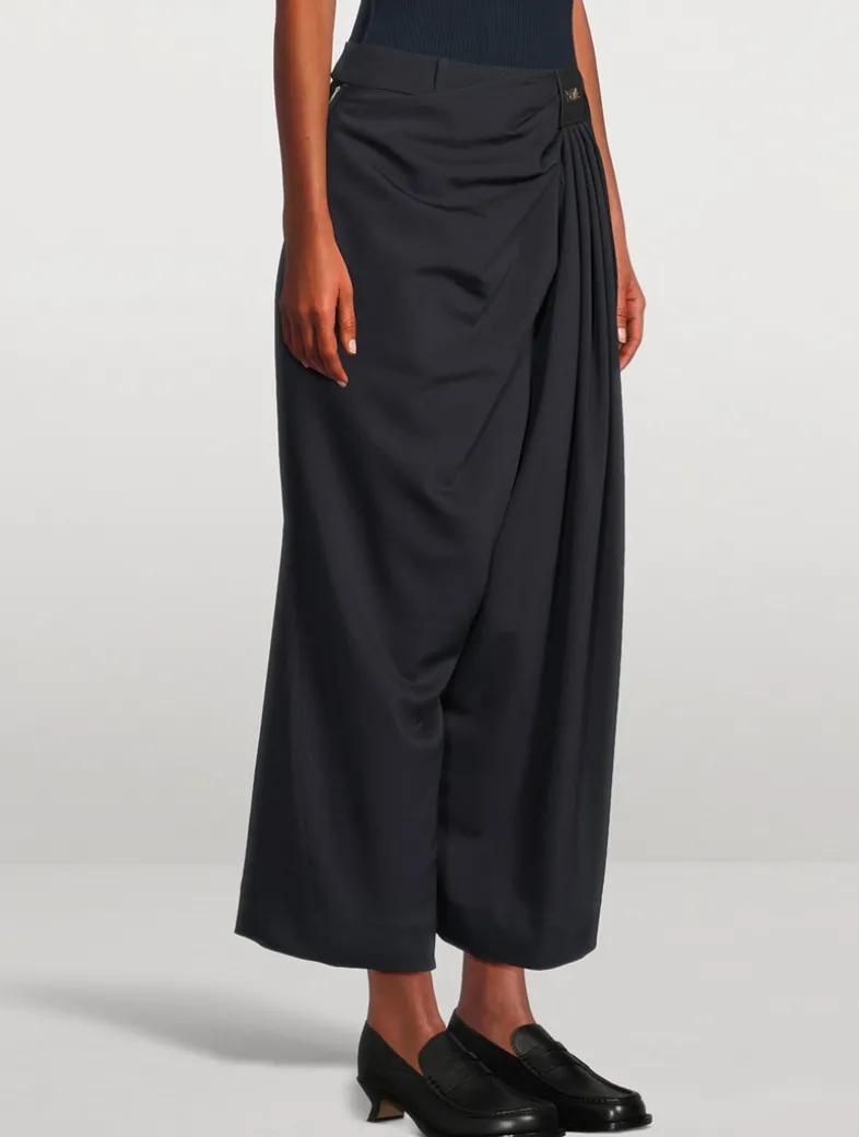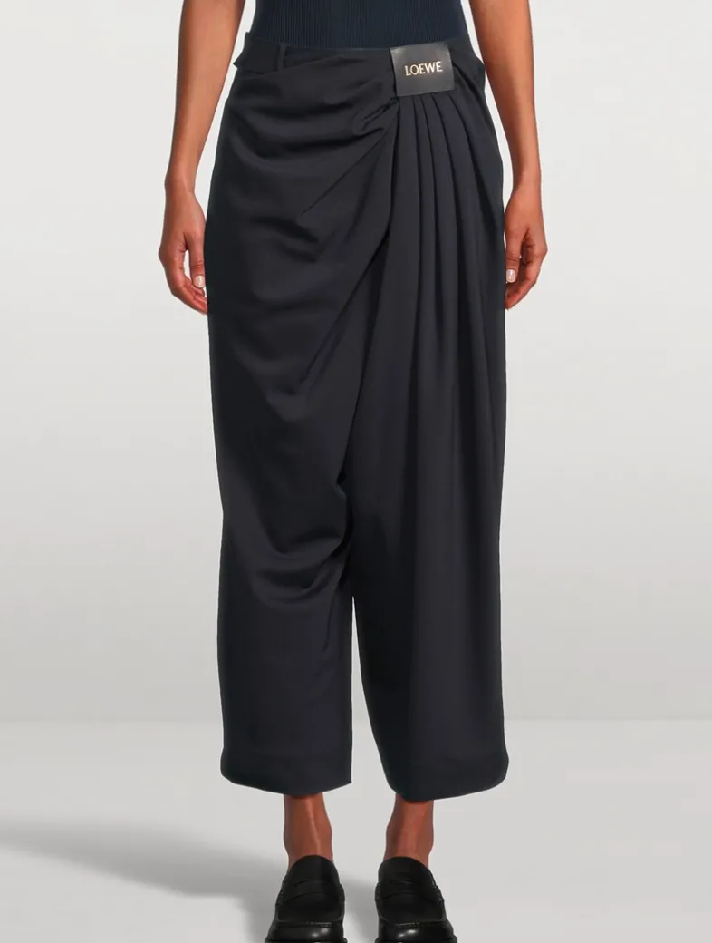 Tailored in fluid, lightweight wool, these loose-leg trousers feature an asymmetric hand-gathered draping at the front. Designed for a relaxed fit, the mid-waist style is complete with side pockets, a rear jet pocket, and a LOEWE-embossed leather patch at the front.