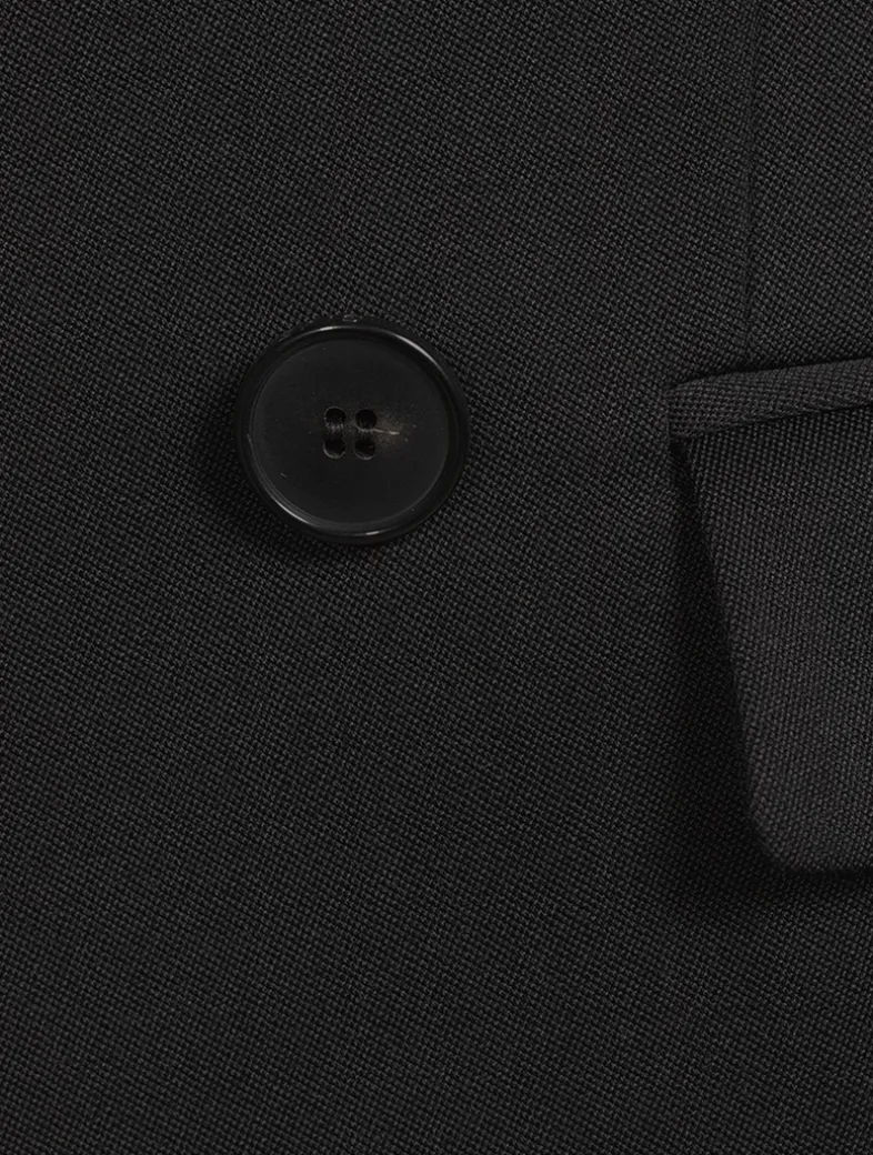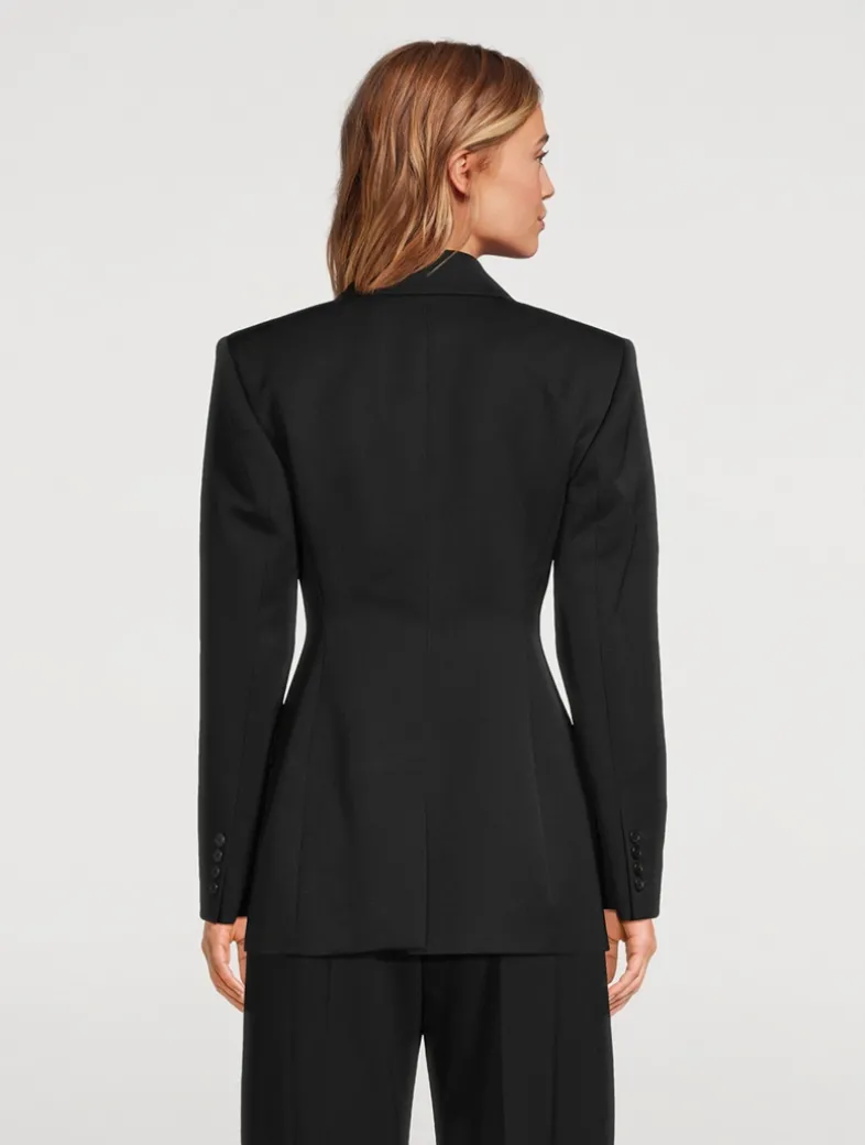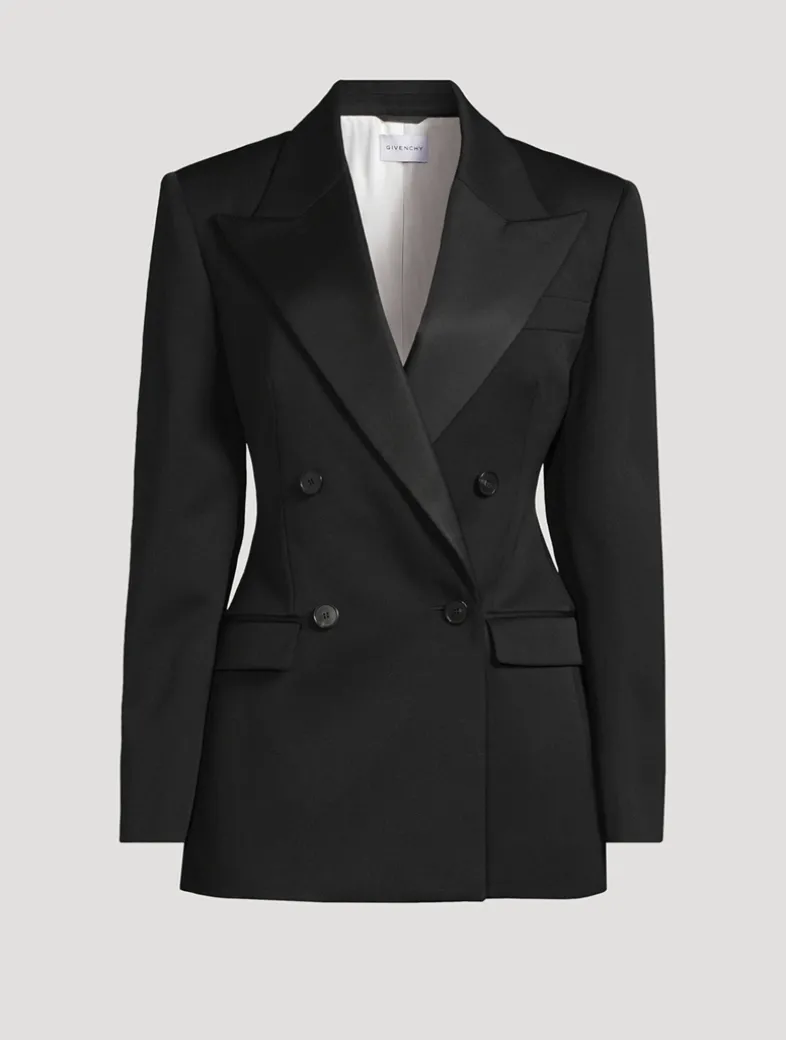 This structured jacket is crafted in grain de poudre wool, and features a satin pointed collar, and double-breasted silhouette. Featuring a satin lining, this blazer is finished with buttoned cuffs, one chest pocket, and two front flap pockets.