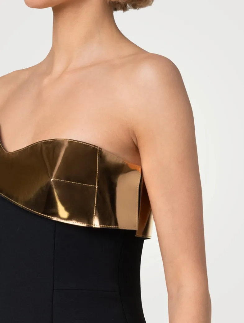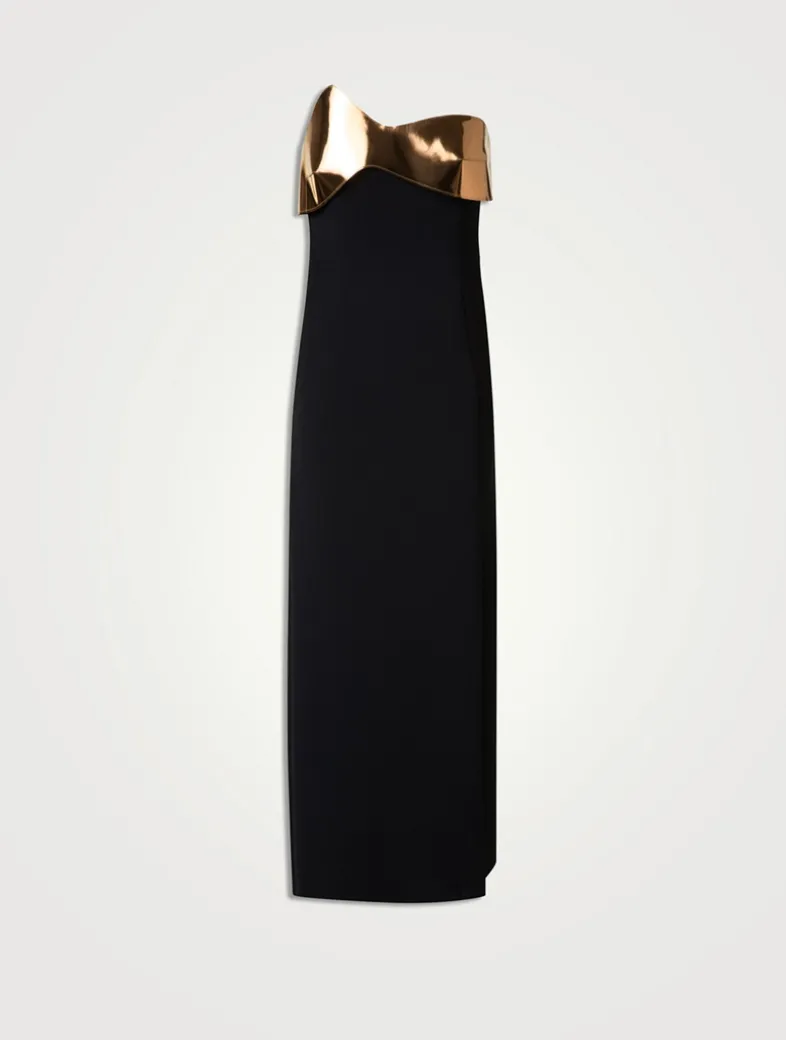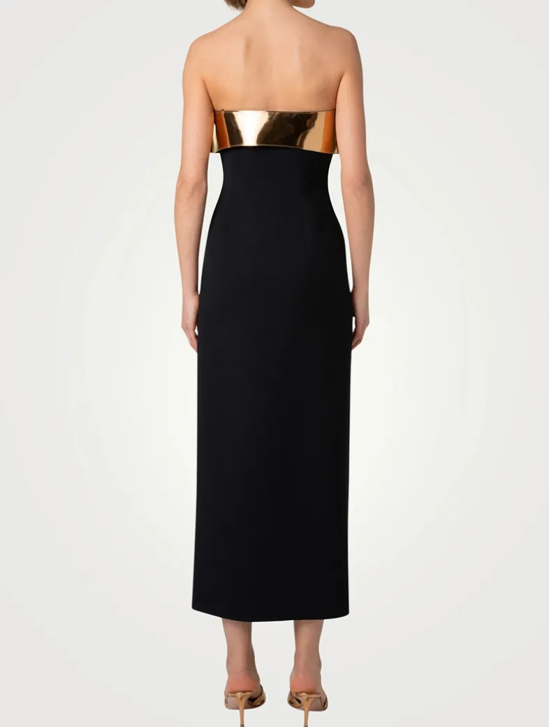 Made from wool double-face, this strapless midi dress is cut in a fitted silhouette and designed with a concealed side zipper closure. Finished with a metallic leather asymmetrical bustier and a flattering side slit.