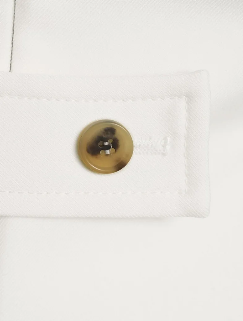 Flaunting a militaristic charm, this sleeveless mini is embellished with buttoned detailing at the collar, shoulders, front body, and back waist tab. The dress is crafted from wool gabardine and designed with exaggerated bombe hips and flap pockets. Made with certified wool yarn.