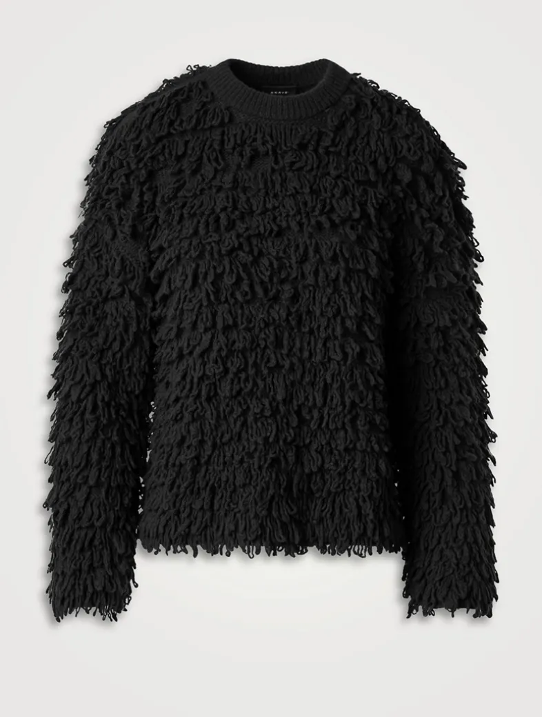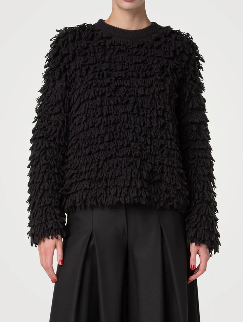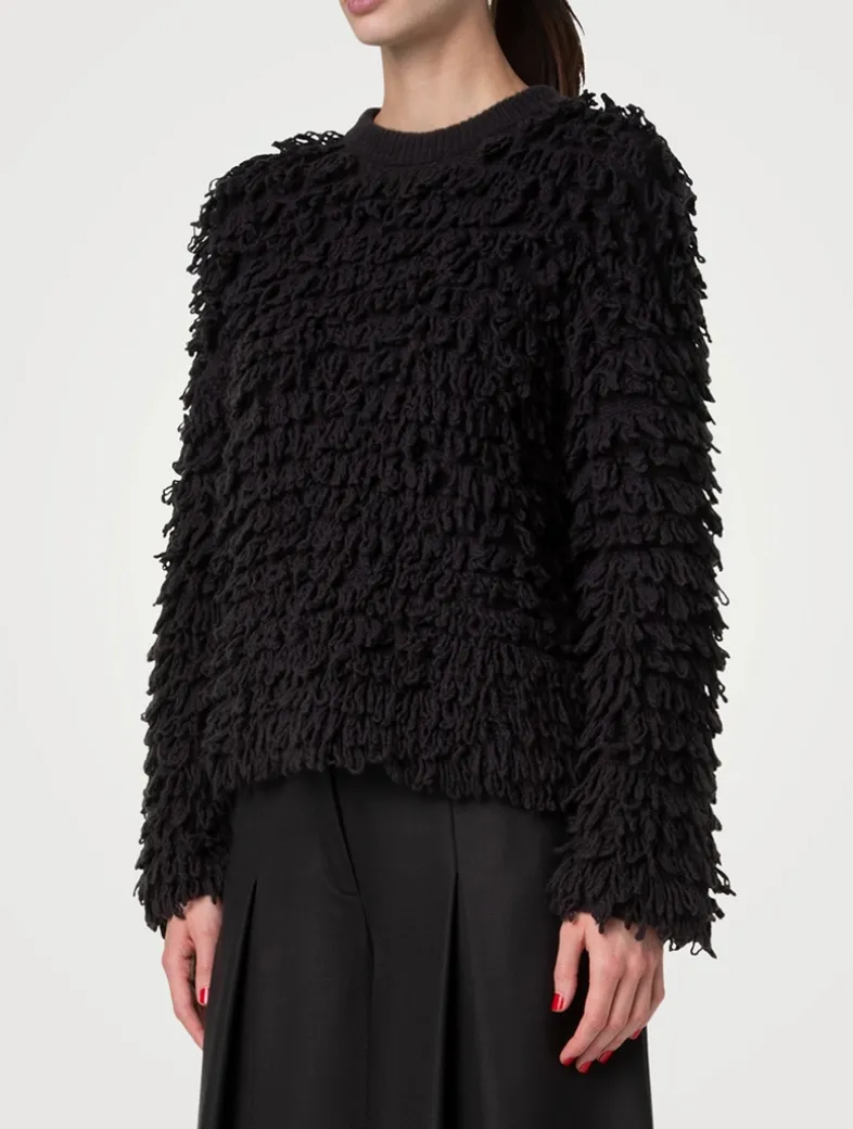 Crafted of a luxurious wool, silk, and cashmere blend, this cozy sweater is detailed with a crew neckline and accented by all-over loop knit detailing.